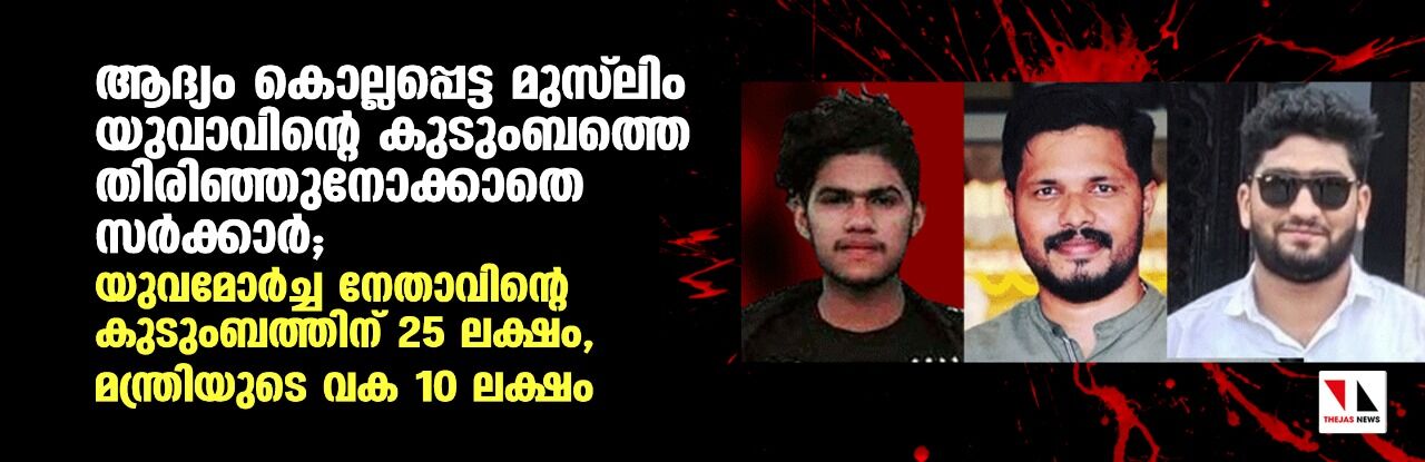 ആദ്യം കൊല്ലപ്പെട്ട മുസ് ലിം യുവാവിന്റെ കുടുംബത്തെ തിരിഞ്ഞുനോക്കാതെ സര്ക്കാര്; യുവമോര്ച്ച നേതാവിന്റെ കുടുംബത്തിന് 25 ലക്ഷം, മന്ത്രിയുടെ വക 10 ലക്ഷം