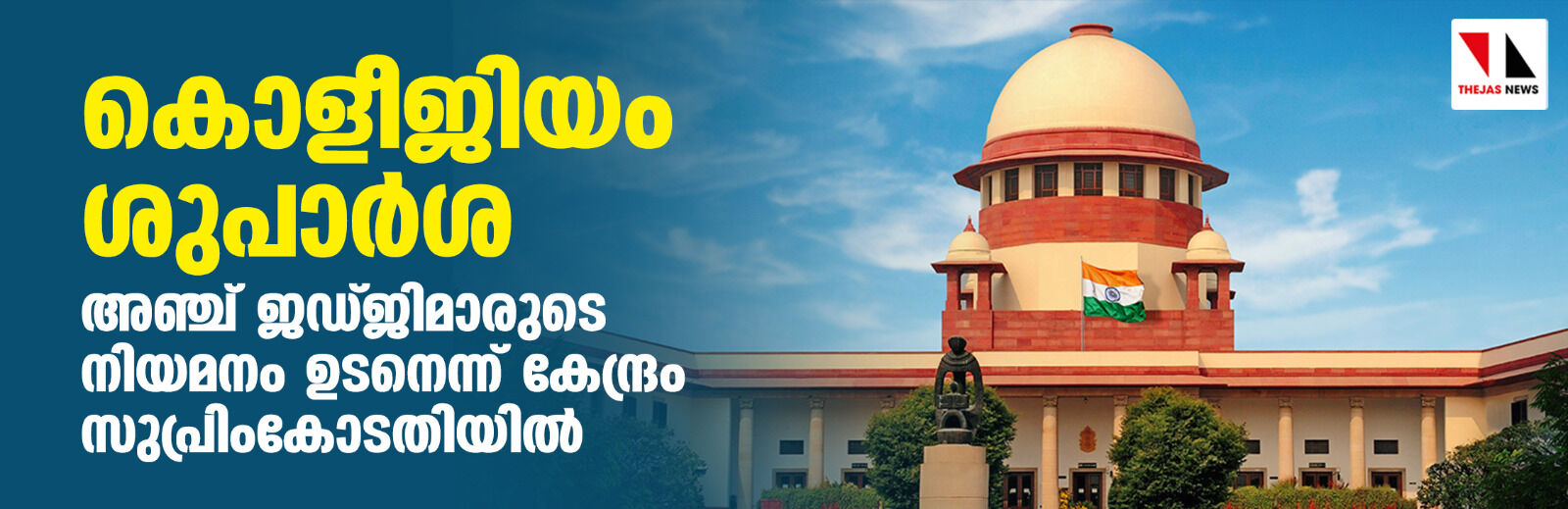 കൊളീജിയം ശുപാര്ശ: അഞ്ച് ജഡ്ജിമാരുടെ നിയമനം ഉടനെന്ന് കേന്ദ്രം സുപ്രിംകോടതിയില്