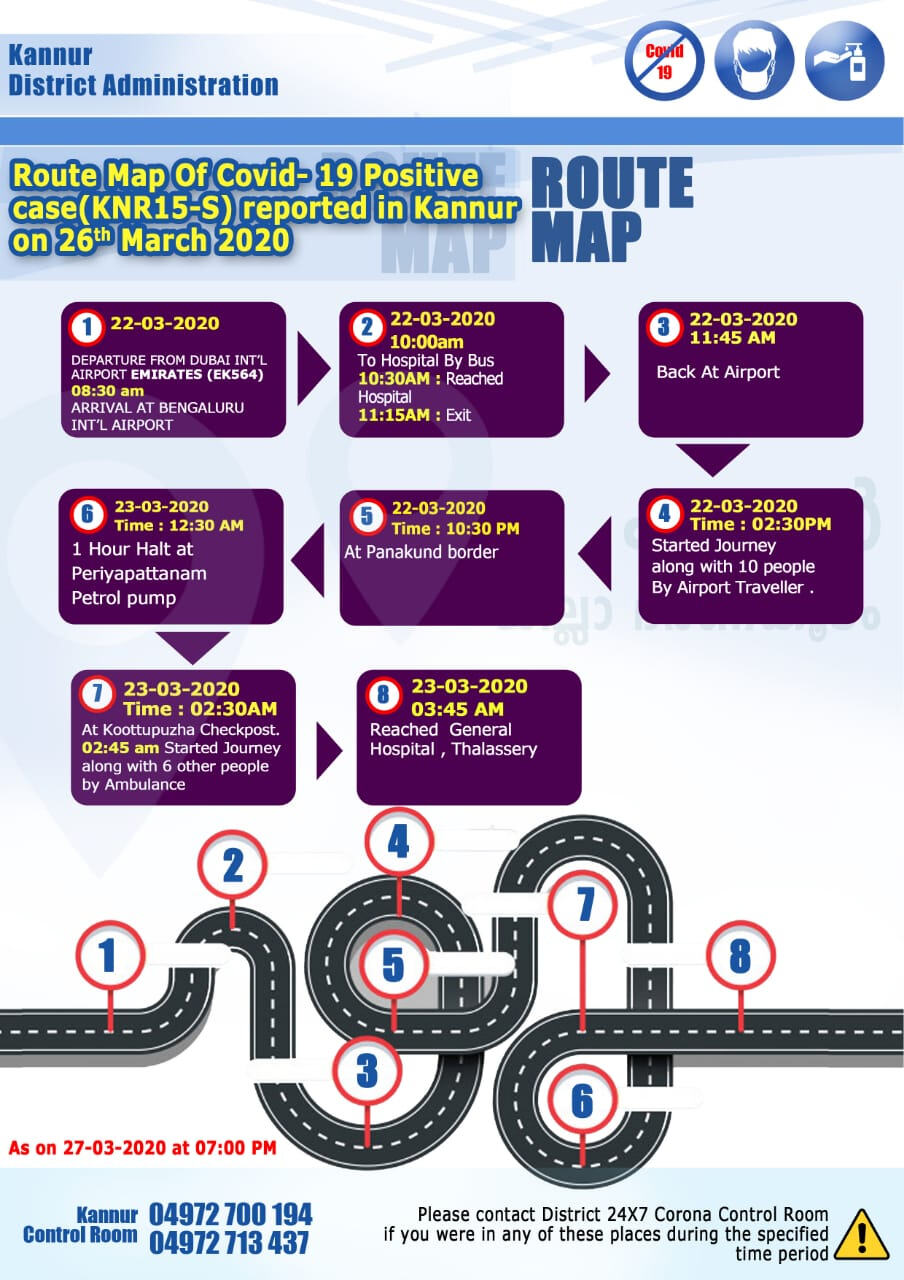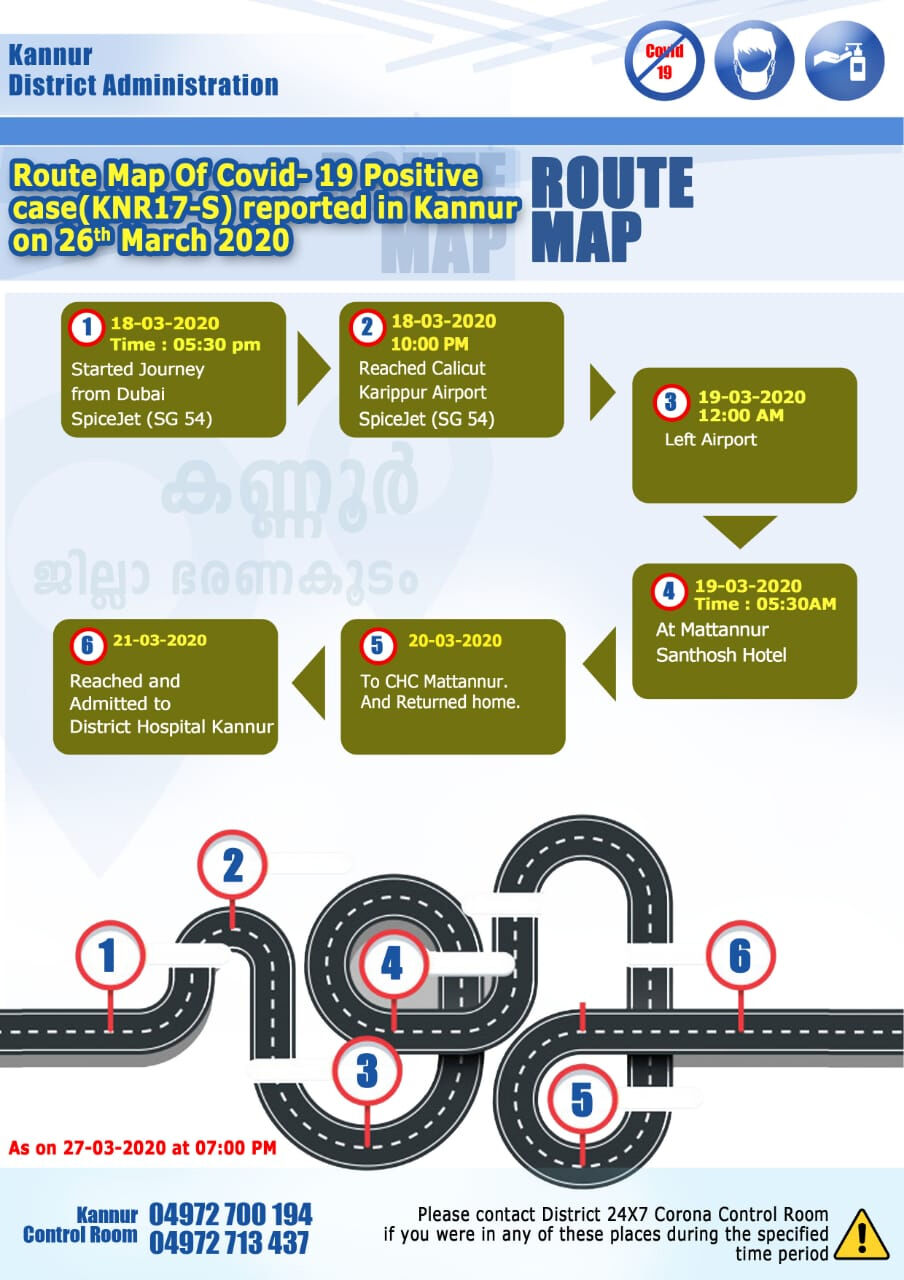 മാര്ച്ച് 21ന് എമിറേറ്റ്സ് എയര്വേയ്സിന്റെ ഇകെ 566 വിമാനത്തില് ദുബയില് നിന്ന് ബെംഗളൂരുവിലെത്തിയ ശിവപുരം സ്വദേശി, അവിടെയുള്ള ആകാശ് ഹോസ്പിറ്റലില് വച്ച് സ്ക്രീനിങിനു വിധേയനായി പിറ്റേന്ന് പുലര്ച്ചെ ബസ് മാര്ഗം വീട്ടിലെത്തുകയായിരുന്നു. 24ന് നേരിയ പനി അനുഭവപ്പെട്ടതിനെ തുടര്ന്ന് ആരോഗ്യ വകുപ്പ് അധികൃതര് തലശ്ശേരി ജനറല് ആശുപത്രിയിലെത്തിച്ച് പരിശോധനയ്ക്ക് വിധേയനാക്കി.