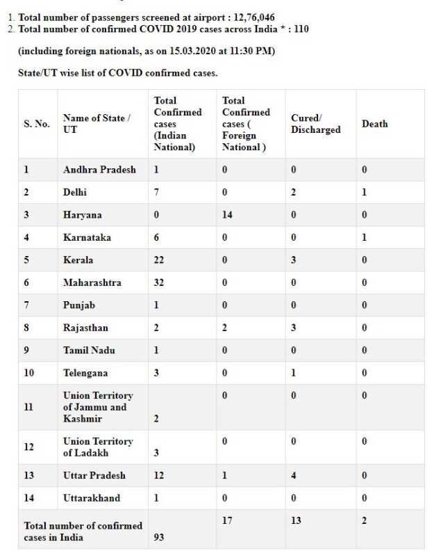 ന്യൂഡല്ഹി: രാജ്യത്ത് കൊറോണ വൈറസ് ബാധ സ്ഥിരീകരിച്ചവരുടെ എണ്ണം 110 ആയി ഉയര്ന്നതായി ദേശീയ ആരോഗ്യ മന്ത്രാലയം അറിയിച്ചു. ഉത്തരാഖണ്ഡില് ആദ്യ കേസും മഹാരാഷ്ട്രയിലും ഉത്തര്പ്രദേശിലും പുതിയ കേസുകളും റിപ്പോര്ട്ട് ചെയ്തിട്ടുണ്ട്.ഡല്ഹിയിലും കര്ണാടകയിലും മരിച്ച രണ്ടു പേരും ഇതില് ഉള്പ്പെടും.