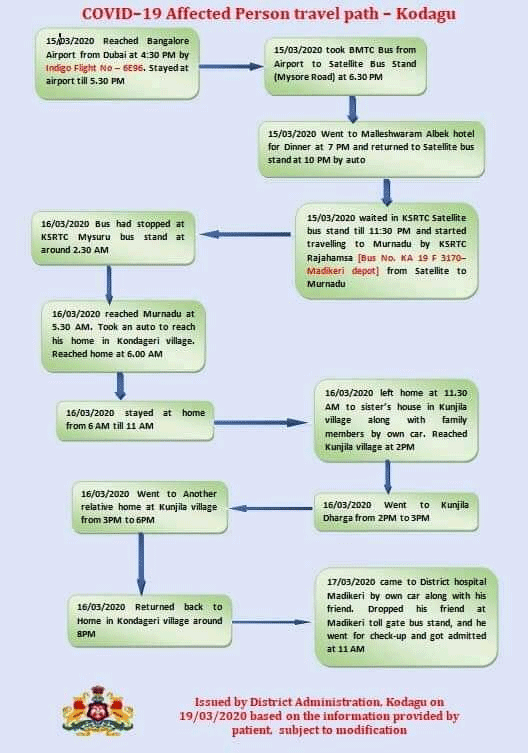 15ന് വൈകീട്ട് 4.30ന് ബംഗളൂരു വിമാനത്താവളത്തില് എത്തിയ ആള് ഒരുമണിക്കൂറോളം എയര്പോര്ട്ടില് ചിലവഴിച്ചിട്ടുണ്ട്. തുടര്ന്ന് ബിഎംടിസി ബസില് 6.30ന് മൈസൂര് റോഡിലുള്ള സാറ്റലൈറ്റ് ബസ് സ്റ്റാന്റില് എത്തി. അവിടെ നിന്ന് മല്ലേശ്വരം അല്ബേക്ക് ഹോട്ടലില് നിന്ന് ഭക്ഷണം കഴിച്ച് രാത്രി 10ന് ഓട്ടോയില് സാറ്റലൈറ്റ് ബസ് സ്റ്റാന്റിലേക്ക് തന്നെ മടങ്ങി. അവിടെ നിന്ന് രാത്രി 11.30നുള്ള ബസ്സിലാണ് കുടകിലേക്ക് മടങ്ങിയത്. രോഗം സ്ഥിരീകരിച്ചയാളുടെ വിശദമായ റൂട്ട് മാപ്പ് പ്രസിദ്ധീകരിച്ചിട്ടുണ്ട്.