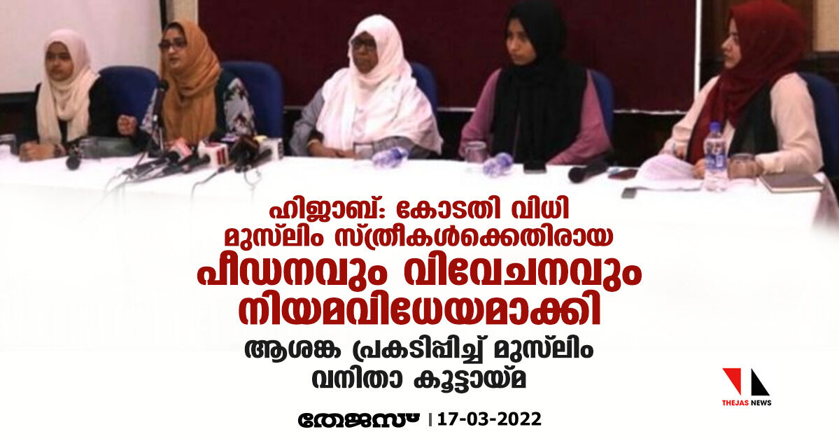 ഹിജാബ്: കോടതി വിധി മുസ്ലിം സ്ത്രീകള്ക്കെതിരായ പീഡനവും വിവേചനവും നിയമവിധേയമാക്കി; ആശങ്ക പ്രകടിപ്പിച്ച് മുസ്ലിം വനിതാ കൂട്ടായ്മ