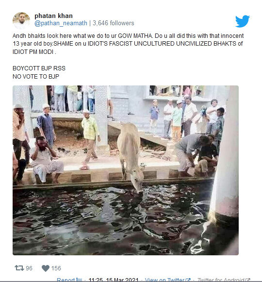 ഇത്തരം വാര്ത്തകള്ക്കിടെയാണ് പള്ളി ഹൗളില്(മുസ് ലിംകള് നമസ്കാരത്തിനായി അംഗശുദ്ധി വരുത്തുന്ന സ്ഥലം) നിന്ന് പശു വെള്ളം കുടിക്കുന്ന ചിത്രം പുറത്തുവന്നിട്ടുള്ളത്. തൊപ്പിയും താടിയുമുള്ള മുസ് ലിംകള് സമീപത്തു നിന്ന് നമസ്കാരത്തിനു വേണ്ടി അംഗശുദ്ധി വരുത്തുന്നതിനിടെയെത്തിയ പശു ദാഹമകറ്റാന് ഹൗളില് നിന്ന് വെള്ളം കുടിക്കുകയാണ്. പശുവിനെ ആരുംതന്നെ പിന്തിരിപ്പിക്കുകയോ വെള്ളം കുടിക്കുന്നത് തടസ്സപ്പെടുത്തുകയോ ചെയ്യുന്നില്ല. നിരവധി പേര് അതേ ഹൗളില് നിന്ന് അംഗശുദ്ധി വരുത്തുന്നുണ്ട്. സമീപത്ത് തന്നെ കുട്ടികള് ഉള്പ്പെടെ നോക്കിനില്ക്കുന്നുണ്ട്. ഇത്തരമൊരു ചിത്രത്തിനു വര്ത്തമാന ഇന്ത്യയില് ഏറെ കാലികപ്രസക്തിയുണ്ട്. ദി കോഗ്നറ്റ് ആണ് ചിത്രം നല്കിയിട്ടുള്ളത്. അജ്ഞാതന് എടുത്ത ചിത്രം എന്നാണ് അടിക്കുറിപ്പ് നല്കിയിട്ടുള്ളത്. ആരാണ്, എപ്പോഴാണ്, എവിടെ നിന്നാണ് ചിത്രം പകര്ത്തിയതെന്ന് വ്യക്തമല്ല. ''അന്ധ ഭക്തരേ നിങ്ങളുടെ ഗോ മാതായെ എന്തുചെയ്യുന്നുവെന്ന് ഇവിടെ നോക്കൂ. നിരപരാധിയായ 13 വയസുള്ള ബാലനെ നിങ്ങള് എന്താണ് ചെയ്തത്. വിഡ്ഡികളും ഫാഷിസ്റ്റുകളും സംസ്കാരമില്ലാത്തവരുമായ മോദിയുടെ വിഡ്ഡികളായ അന്ധഭക്തരെ ഓര്ത്ത് ലജ്ജിക്കുന്നു'' എന്ന കാപ്ഷനോടെയാണ് ചിലര് ഇത് ട്വിറ്ററില് പങ്കുവച്ചത്.