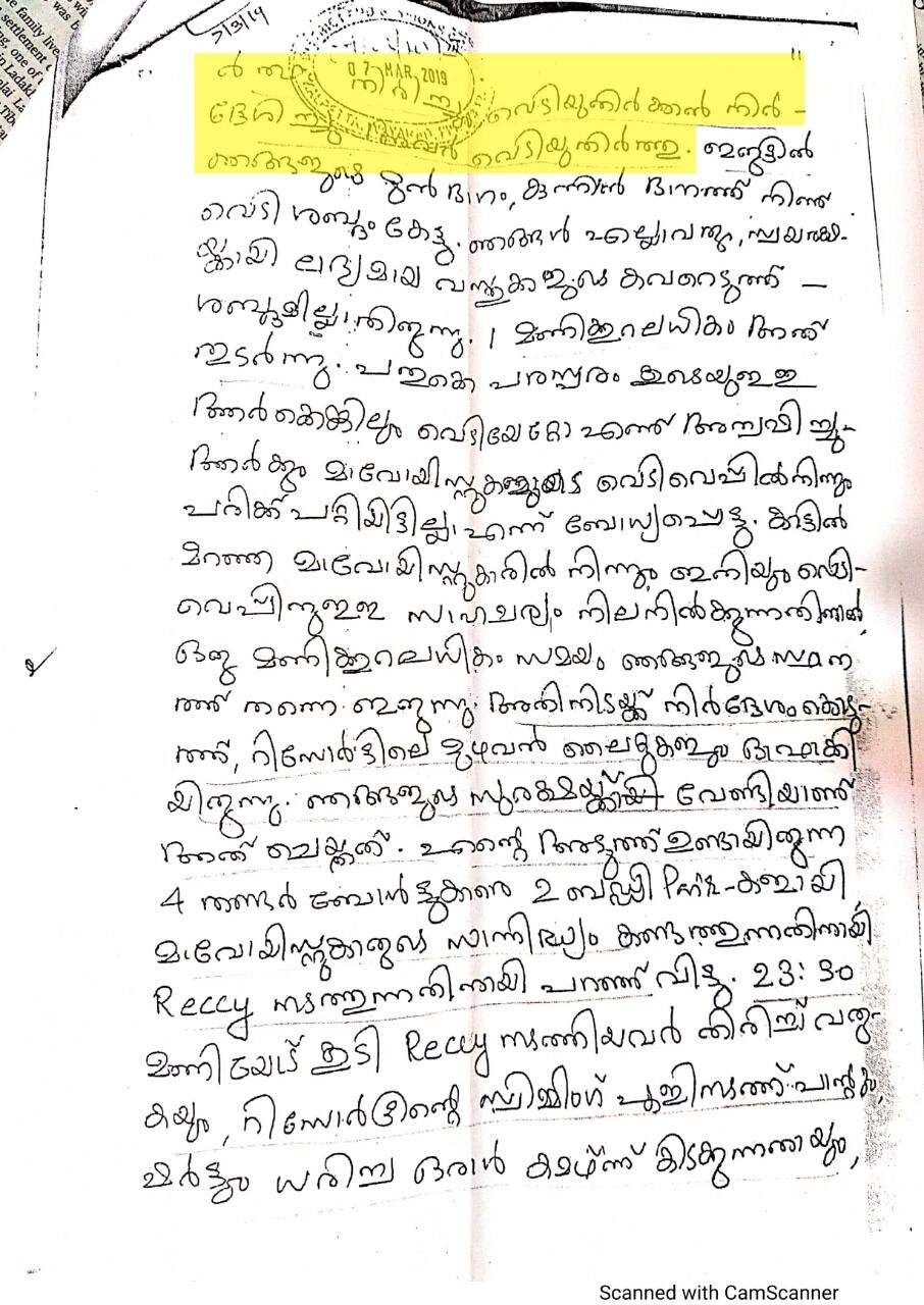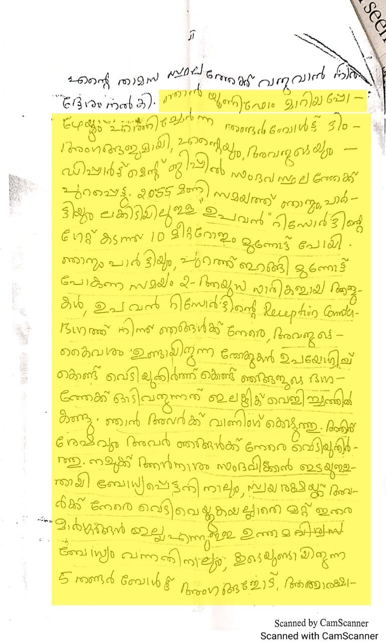 ഞാനും പാർട്ടിയും പുറത്തിറങ്ങി മുന്നോട്ട് പോകുന്ന സമയം രണ്ട് ആയുധധാരികളായ ആളുകൾ ഉപവൻ റിസോർട്ടിന്റെ റിസപ്ഷൻ കൗണ്ടർ ഭാഗത്തു നിന്ന് ഞങ്ങൾക്കു നേരേ അവരുടെ കൈവശം ഉണ്ടായിരുന്ന തോക്കുകൾ ഉപയോഗിച്ച് കൊണ്ട് വെടിയുതിർത്തുകൊണ്ട് ഞങ്ങളുടെ ഭാഗത്തേക്ക് ഓടിവരുന്നത് ഇലക്ട്രിക് വെളിച്ചത്തിൽ കണ്ടു.