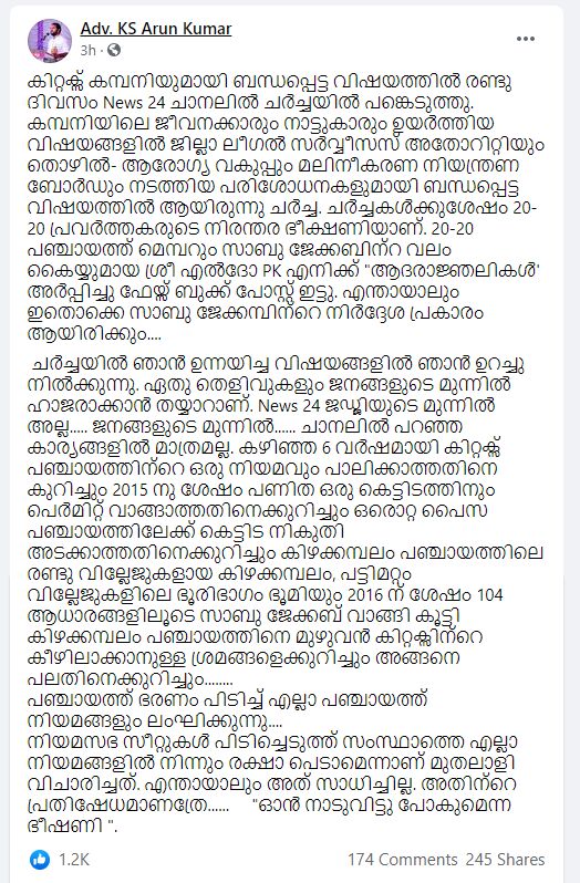 ചര്ച്ചയില് ഞാന് ഉന്നയിച്ച വിഷയങ്ങളില് ഞാന് ഉറച്ചു നില്ക്കുന്നു. ഏതു തെളിവുകളും ജനങ്ങളുടെ മുന്നില് ഹാജരാക്കാന് തയ്യാറാണ്. ട്വന്റിഫോർ ന്യൂസ് ജഡ്ജിയുടെ മുന്നില് അല്ല….. ജനങ്ങളുടെ മുന്നില്…… ചാനലില് പറഞ്ഞ കാര്യങ്ങളില് മാത്രമല്ല. കഴിഞ്ഞ 6 വര്ഷമായി കിറ്റക്സ് പഞ്ചായത്തിന്റെ ഒരു നിയമവും പാലിക്കാത്തതിനെ കുറിച്ചും 2015 നു ശേഷം പണിത ഒരു കെട്ടിടത്തിനും പെര്മിറ്റ് വാങ്ങാത്തതിനെക്കുറിച്ചും ഒരൊറ്റ പൈസ പഞ്ചായത്തിലേക്ക് കെട്ടിട നികുതി അടക്കാത്തതിനെക്കുറിച്ചും കിഴക്കമ്പലം പഞ്ചായത്തിലെ രണ്ടു വില്ലേജുകളായ കിഴക്കമ്പലം, പട്ടിമറ്റം വില്ലേജുകളിലെ ഭൂരിഭാഗം ഭൂമിയും 2016 ന് ശേഷം 104 ആധാരങ്ങളിലൂടെ സാബു ജേക്കബ് വാങ്ങി കൂട്ടി കിഴക്കമ്പലം പഞ്ചായത്തിനെ മുഴുവന് കിറ്റക്സിന്റെ കീഴിലാക്കാനുള്ള ശ്രമങ്ങളെക്കുറിച്ചും അങ്ങനെ പലതിനെക്കുറിച്ചും. പഞ്ചായത്ത് ഭരണം പിടിച്ച് എല്ലാ പഞ്ചായത്ത് നിയമങ്ങളും ലംഘിക്കുന്നുവെന്നും അദ്ദേഹം പറഞ്ഞു.