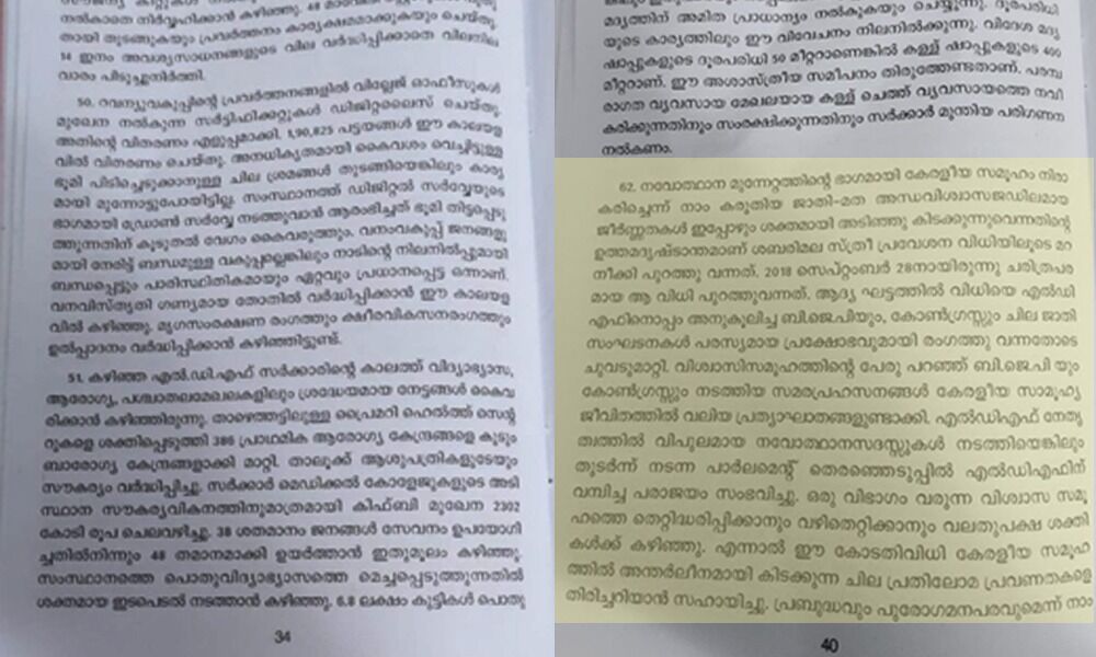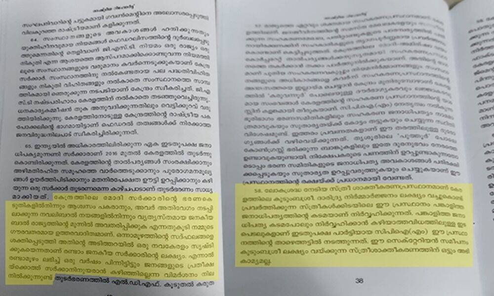 ലോകശ്രദ്ധ നേടിയ സ്ത്രീശാക്തീകരണ പ്രസ്ഥാനമാണ് കുടുംബശ്രി. പങ്കാളിത്ത ജനാധിപത്യത്തിന്റെ കടമപോലും നിർവഹിക്കാൻ കഴിയാത്ത വിധമുള്ള ഇടപെടലാണ് സിപിഎം നടത്തുന്നത്. കള്ള് ചെത്ത് വ്യവസായത്തെ സംരക്ഷിക്കാൻ സർക്കാർ ടോഡി ബോർഡ് രൂപീകരിക്കാൻ നിയമം പാസാക്കിയെങ്കിലും ഇതുവരേയും നടപ്പാക്കിയിട്ടില്ല. അതേസമയം വിദേശമദ്യത്തിന് പ്രാധാന്യം നൽകുന്നു തുടങ്ങിയ സർക്കാർ വിമർശനവും പ്രവർത്തന റിപോർട്ടിൽ ഇടംപിടിച്ചിട്ടുണ്ട്.