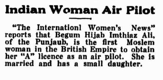 1939 ല് അഥവാ ഇന്ത്യാ മഹാരാജ്യം സ്വാതന്ത്ര്യം നേടുന്നതിന് എട്ടു വര്ഷം മുമ്പ് ഒരു മുസ്ലിം വനിത വിമാനം പറത്താനുള്ള 'എ' ലെവല് ലൈസന്സ് നേടിയിരുന്നു. ബ്രിട്ടീഷ് ഇന്ത്യയില് പൈലറ്റായ ആദ്യ മുസ്ലിം വനിതയായ അവരുടെ പേരാണ് ബീഗം ഹിജാബ് ഇംതിയാസ് അലി. വൈമാനികയായ ആദ്യ ഇന്ത്യന് മുസ്ലിം വനിത എന്ന ഖ്യാതി മാത്രമായിരുന്നില്ല ബീഗം ഹിജാബിനെ ശ്രദ്ധേയയാക്കിയത്. വിവാഹിതയും ഒരു കുട്ടിയുടെ മാതാവുമായിരുന്ന അവരെ ഉറുദു സാഹിത്യത്തെ കുറിച്ച് അല്പ്പെങ്കിലും അറിയുന്നവര്ക്ക് പരിചയപ്പെടുത്തിക്കൊടുക്കേണ്ടിവരില്ല. ഉറുദു സാഹിത്യത്തിന് അത്രയേറെ സംഭാവനകള് അര്പ്പിച്ച മഹതിയായിരുന്നു ബീഗം ഹിജാബ്. ഇന്ത്യയിലെ ആദ്യകാല വനിതാ പൈലറ്റുമാരും ജെആര്ഡി ടാറ്റയുടെ സഹോദരികളുമായ സാലി ടാറ്റ്, റോദാബേ ടാറ്റ, ഊര്മിള പരീക് എന്നിവരുടെ കാലത്ത് ലൈസന്സ് കരസ്ഥമാക്കിയ ആദ്യ മുസ്ലിം വനിതാ പൈലറ്റാണ് ബീഗം ഹിജാബ്. ബ്രിട്ടീഷ് ഇന്ത്യയിലെ ആദ്യ വനിതാ പൈലറ്റായി അറിയപ്പെടുന്ന സരള തക്രാലും ബീഗം ഹിജാബും 1936 ല് ഒരേ സമയത്താണ് പൈലറ്റ് ലൈസന്സ് നേടുന്നത് എന്നതാണ് പ്രത്യേകത. സരളയും ബീഗം ഹിജാബും ലാഹോറിലെ ഫ്ലൈയിങ് സ്കൂളില് നിന്നാണ് വിമാനം പറത്താന് പരിശീലനം നേടിയത്. ടാറ്റ സഹോദരികള് മുംബൈയില് നിന്നാണ് പഠിച്ചത്. ഹൈദരാബാദിലെ കുലീന കുടുംബത്തില് ജനിച്ച ബീഗം ഹിജാബ് വിവാഹം കഴിച്ചത് പ്രമുഖ ഉറുദു എഴുത്തു കാരനായ ഇംതിയാസ് അലിയെയായിരുന്നു.
