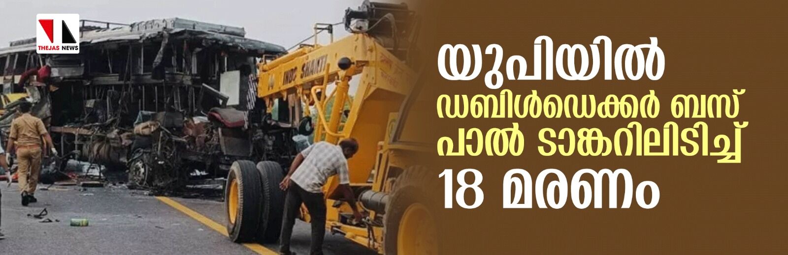 യുപിയില് ഡബിള്ഡെക്കര് ബസ് പാല് ടാങ്കറിലിടിച്ച് 18 മരണം