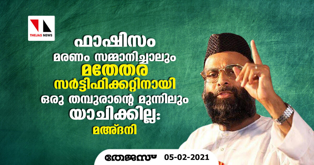 ഫാഷിസം മരണം സമ്മാനിച്ചാലും മതേതര സര്ട്ടിഫിക്കറ്റിനായി ഒരു തമ്പുരാന്റെ മുന്നിലും യാചിക്കില്ല: മഅ്ദനി