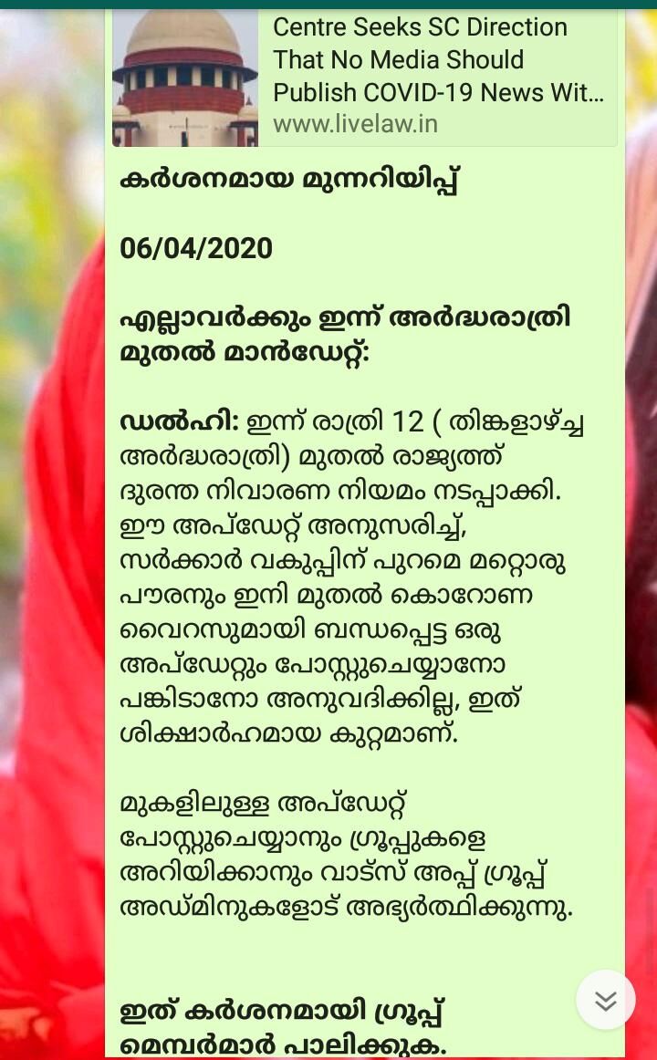 സര്ക്കാരിനല്ലാതെ മറ്റാര്ക്കും കൊറോണയുമായി ബന്ധപ്പെട്ട വിവരങ്ങള് പ്രചരിപ്പിക്കാനാകില്ലെന്നും ഉത്തരവ് ലംഘിക്കുന്നത് ശിക്ഷാര്ഹമായ കുറ്റകൃത്യമാണെന്നും ലൈവ് ലോ വെബ്സൈറ്റിന്റെ ലിങ്കിനൊപ്പം പ്രചരിച്ച സന്ദേശത്തില് പറയുന്നു.