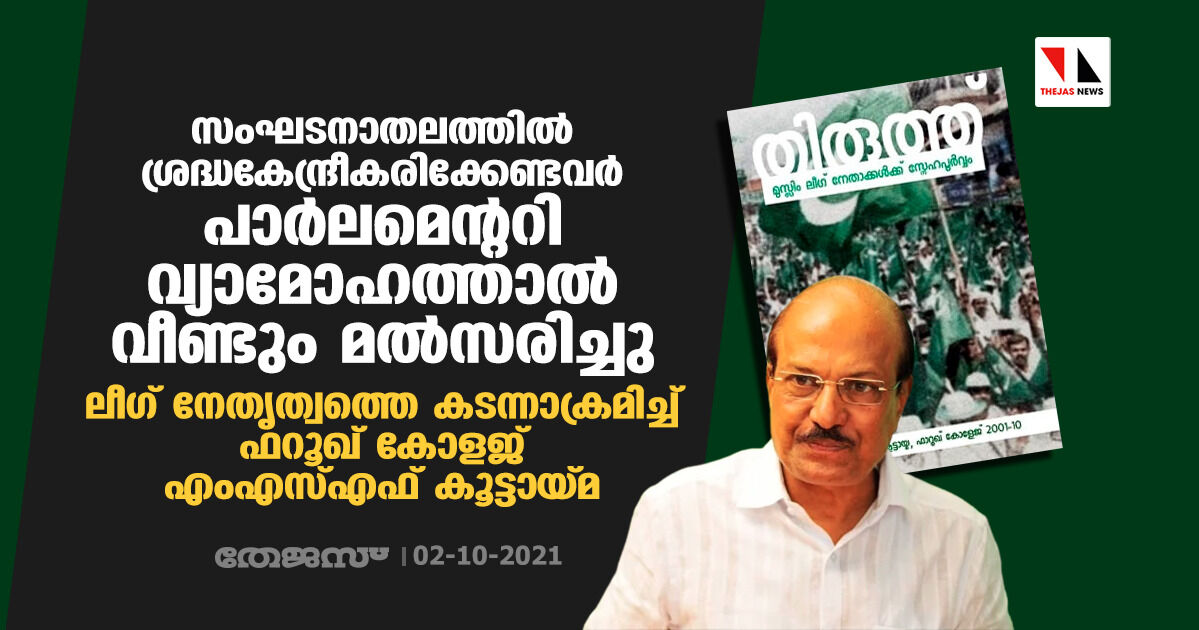 സംഘടനാതലത്തില് ശ്രദ്ധ കേന്ദ്രീകരിക്കേണ്ടവര് പാര്ലമെന്ററി വ്യാമോഹത്താല് വീണ്ടും മല്സരിച്ചു; ലീഗ് നേതൃത്വത്തെ കടന്നാക്രമിച്ച് ഫറൂഖ് കോളജ് എംഎസ്എഫ് കൂട്ടായ്മ