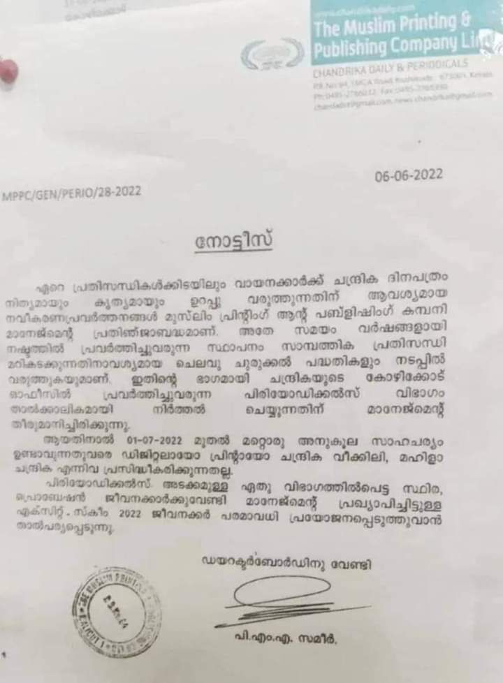'ഏറെ പ്രതിസന്ധികള്ക്കിടയിലും വായനക്കാര്ക്ക് ചന്ദ്രിക ദിനപത്രം നിത്യമായും കൃത്യമായും ഉറപ്പ് വരുത്തുന്നതിന് ആവശ്യമായ നവീകരണ പ്രവര്ത്തനങ്ങള് മുസ് ലിം പ്രിന്റിംഗ് ആന്റ് പബ്ലിഷിംഗ് കമ്പനി മാനേജ്മെന്റ് പ്രതിജ്ഞാബന്ധമാണ്. അതേസമയം, വര്ഷങ്ങളായി നഷ്ടത്തില് പ്രവര്ത്തിച്ചുവരുന്ന സ്ഥാപനം സാമ്പത്തിക പ്രതിസന്ധി മറിക്കുന്നതിനാവശ്യമായ ചെലവു ചുരുക്കല് പദ്ധതികളും നടപ്പില് വരുത്തുകയാണ്. ഇതിന്റെ ഭാഗമായി ചന്ദ്രികയും കോഴിക്കോട് ഓഫിസില് പ്രവര്ത്തിച്ചുവരുന്ന പിരിയോഡിക്കല്സ് വിഭാഗം താല്ക്കാലികമായി നിര്ത്തല് ചെയ്യുന്നതിന് മാനേജ്മെന്റ് തീരുമാനിച്ചിരിക്കുന്നു. 01-07-2022 മുതല് മറ്റൊരു അനുകൂല സാഹചര്യം ഉണ്ടാവുന്നതുവരെ ഡിജിറ്റലായ പ്രിന്റായോ ചന്ദ്രിക വീക്കിലി, മഹിളാ ചന്ദ്രിക എന്നിവ പ്രസിദ്ധീകരിക്കുന്നതല്ല' ഡയറക്ടര് ബോര്ഡിന് വേണ്ടി പി എം എ സമീര് ജീവനക്കാര്ക്ക് നല്കിയ നോട്ടിസില് പറയുന്നു. സാമ്പത്തിക പ്രതിസന്ധിയെ തുടര്ന്ന് ചന്ദ്രിക ദിനപത്രത്തില് വരുത്തിയ ചെലവ് ചുരുക്കല് നടപടികള് ആഴ്ച്ചപതിപ്പിലും മഹിളാ ചന്ദ്രികയിലും സ്വീകരിക്കാനാണ് മാനേജ്മെന്റ് തീരുമാനം. അതിന്റെ ഭാഗമായി 'എക്സിറ്റ് സ്കീം' ജീവനക്കാര് പരമാവധി പ്രയോജനപ്പെടുത്തണമെന്നും നോട്ടിസില് അറിയിച്ചു. 'പീരിയോഡിക്കല്സ് അടക്കമുള്ള ഏതു വിഭാഗത്തില്പ്പെട്ട സ്ഥിര, പ്രൊബേഷന് ജീവനക്കാര്ക്കു വേണ്ടി മാനേജ്മെന്റ് പ്രഖ്യാപിച്ചിട്ടുള്ള 'എക്സിറ്റ് സ്കീം-2022' ജീവനക്കാര് പരമാവധി പ്രയോജനപ്പെടുത്തുവാന് താല്പര്യപ്പെടുന്നു'. നോട്ടിസില് അറിയിച്ചു.