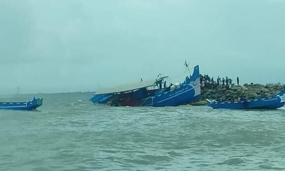 മാറാട് സ്വദേശികളുടെ ഉടമസ്ഥതയിലുള്ള ഇബ്രാഹിം ബാദുഷ എന്ന ഫൈബര് വെള്ളമാണ് തകര്ന്നത്.