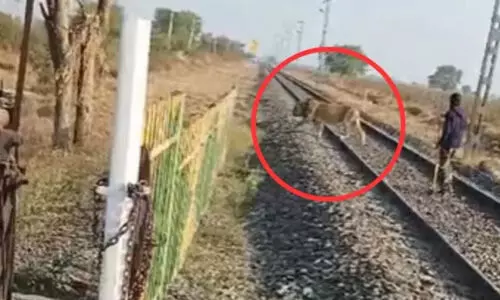 Driving away a lion from the railway track in Gujurat👌 pic.twitter.com/F7M8zgbJOu
