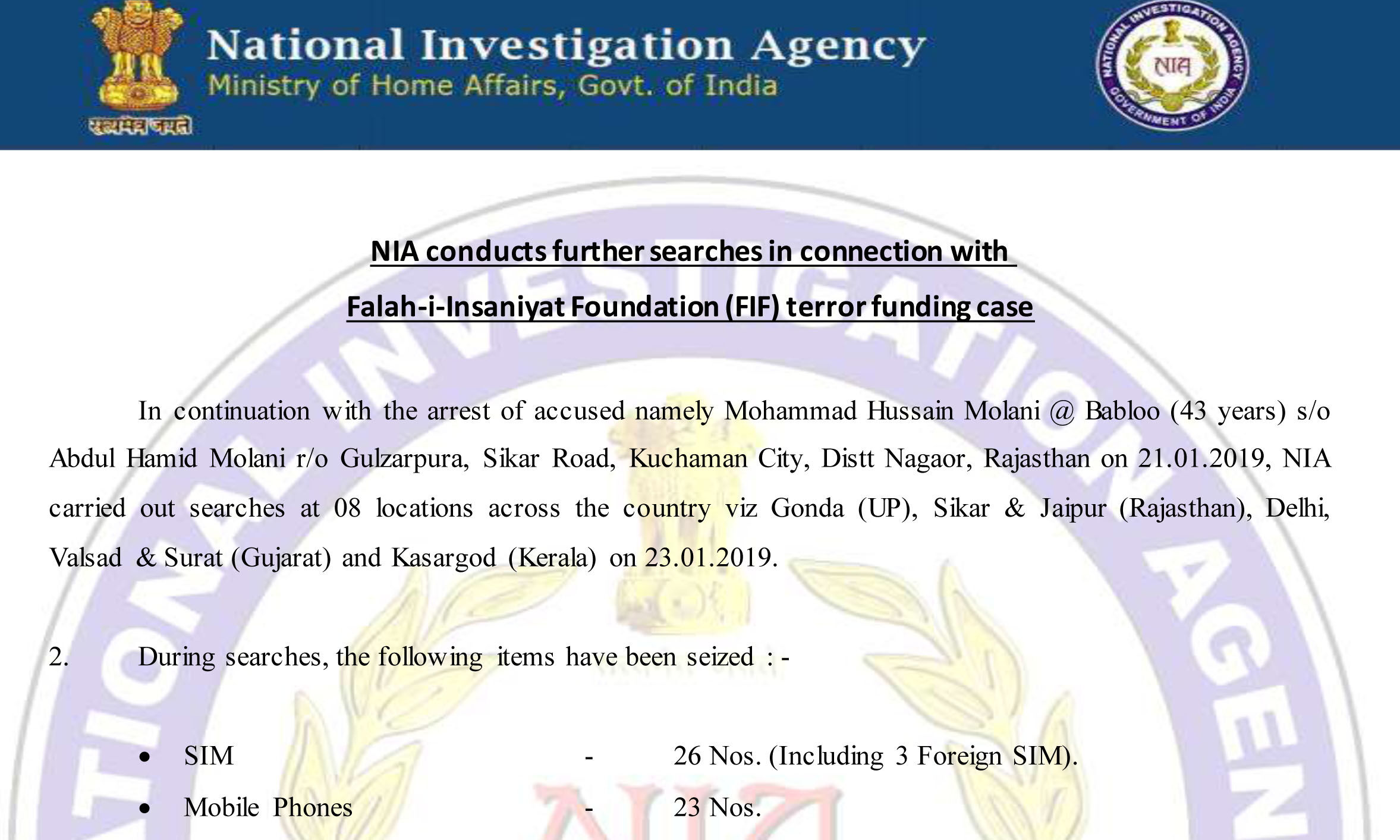 കഴിഞ്ഞ ദിവസം രാജസ്ഥാനിലെ നാഗൂര് ജില്ലയില് കുച്ചമന് സിറ്റി ശിക്കാര് റോഡിലെ ഗുല്സാര്പുര മുഹമ്മദ് ഹുസയ്ന് മൊലാനി എന്ന ബബ്ലു(43)വിനെ എന്ഐഎ അറസ്റ്റ് ചെയ്തിരുന്നു. പാകിസ്താനിലെ ലഷ്കറെ ത്വയ്യിബയുടെ പോഷക സംഘടനയെന്നു വിശേഷിപ്പിക്കുന്ന ജമാഅത്തു ദ്ദഅ്വയുമായി ബന്ധമുള്ള ഫലാഹ് ഇന്സാനിയത് ഫൗണ്ടേഷന് എന്ന സംഘടനയ്ക്കു വേണ്ടിയാണ് ഇവര് രാജ്യത്തെ വിവിധ സ്ഥലങ്ങളില് ഫണ്ട് ശേഖരിച്ചതെന്നാണ് എന്ഐഎ ആരോപിക്കുന്നത്. മുംബൈ ആക്രമണത്തിലുള്പ്പെടെ പങ്കുണ്ടെന്ന് ഇന്ത്യ ആരോപിക്കുന്നയാളാണ് ഹാഫിസ് സഈദ്. പിടിയിലായയാളില്നിന്നു ലഭിച്ച വിവരത്തിന്റെ അടിസ്ഥാനത്തിലാണ് പരിശോധനയെന്നാണു എന്ഐഎ പറയുന്നത്.