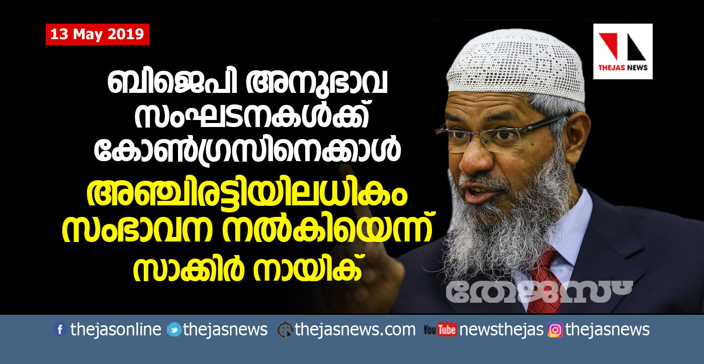 ബിജെപി അനുഭാവ സംഘടനകള്ക്ക് കോണ്ഗ്രസിനെക്കാള് അഞ്ചിരട്ടിയിലധികം സംഭാവന നല്കിയെന്ന് സാക്കിര് നായിക്