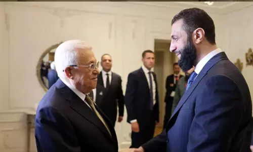 സിറിയന് പ്രസിഡന്റ് അഹമദ് അല് ഷറ, ഫലസ്തീന് അതോറിറ്റി നേതാവ് മഹ്മൂദ് അബാസിനെ കാണുന്നു