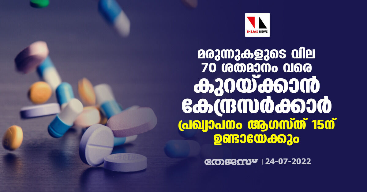 മരുന്നുകളുടെ വില 70 ശതമാനം വരെ കുറയ്ക്കാന് കേന്ദ്രസര്ക്കാര്; പ്രഖ്യാപനം ആഗസ്ത് 15ന് ഉണ്ടായേക്കും