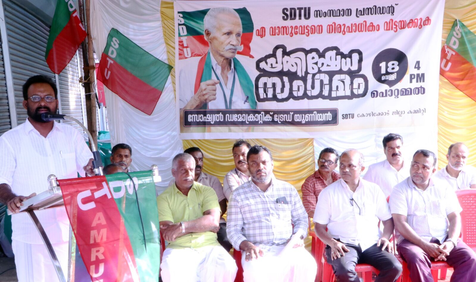 പൊറ്റമ്മല്(കോഴിക്കോട്): ഭരണഘടനാപരമായും സമാധാനപരമായും പ്രതിഷേധിക്കുന്നവരെ കള്ളക്കേസ് ചുമത്തി പിഴയടപ്പിക്കുന്നതിനെതിരേയാണ് വാസുവേട്ടന്റെ ജാമ്യനിഷേധ സമരമെന്ന് സോഷ്യല് ഡമോക്രാറ്റിക് ട്രേഡ് യൂനിയന് (എസ് ഡിടിയു) സംസ്ഥാന ജനറല് സെക്രട്ടറി തച്ചോണം നിസാമുദ്ദീന്. എസ് ഡിടിയു കോഴിക്കോട് ജില്ലാ കമ്മിറ്റി പൊറ്റമ്മലില് സംഘടിപ്പിച്ച പ്രതിഷേധ സംഗമം ഉദ്ഘാടനം ചെയ്യുകയായിരുന്നു അദ്ദേഹം. വാസുവേട്ടന് കോടതി വരാന്തയില് വച്ച് പിണറായി വിജയന്റെ കമ്മ്യൂണിസ്റ്റ് കാപട്യത്തെ തുറന്നുകാട്ടി. ഇത് ജനങ്ങള് തിരിച്ചറിയുന്ന കാലം വരും. ഇങ്ങനെ അപ്രിയ സത്യങ്ങല് പറയുന്നവരെ ജയിലിലടയ്ക്കുന്ന നടപടികളുടെ ഭാഗമാണ് 94 വയസ്സുള്ള വാസുവേട്ടനെ കള്ളക്കേസ് ചുമത്തി കോടതിയില് എത്തിച്ചത്. തെറ്റ് സമ്മതിച്ച് പിഴ അടയ്ക്കാനോ, ജാമ്യത്തില് പുറത്ത് വരാനോ അദ്ദേഹം തയ്യാറായില്ല. കാരണം തെറ്റ് ചെയ്യാത്തവരെ കോടതി കയറ്റി പിഴയടപ്പിച്ച് ഖജനാവ് നിറയ്ക്കുന്നതിനെതിരെ കൂടിയാണ് വാസുവേട്ടന്റെ സമരം. കേരളത്തിലെ ഇടതുപക്ഷ സര്ക്കാര് ഖജനാവ് നിറയ്ക്കാന് വേണ്ടി ജനങ്ങളുടെ മേല് അന്യായമായി പെറ്റിയും പിഴയും ഏര്പ്പെടുത്തുകയാണെന്നും അദ്ദേഹം പറഞ്ഞു. എസ് ഡിടിയു ജില്ലാ പ്രസിഡന്റ് ഹുസയ്ന് മണക്കടവ് അധ്യക്ഷത വഹിച്ച. സംസ്ഥാന സെക്രട്ടറി സലീം കാരാടി, സംസ്ഥാന സമിതി അംഗം ഇസ്മായില് കമ്മന, എസ്ടിയു ജില്ലാ ഖജാഞ്ചി എ ടി അബ്ദു, എസ്എംടിയു കണ്വീനര് ഇ എം ഹമീദ്, കെഎഡിഎഫ് നേതാക്കളായ പ്രജോഷ്, ബാലഗംഗാധരന്, വെല്ഫെയര് പാര്ട്ടി ജില്ലാ ഖജാഞ്ചി ഇ പി അന്വര്, എസ്ഡിപിഐ ജില്ലാ വൈസ് പ്രസിഡന്റ് വാഹിദ് ചെറുവറ്റ, ബിഎസ്പി ജില്ലാ സെക്രട്ടറി കെ ടി വാസു, എസ്ഡിടിയു ജില്ലാ ജനറല് സെക്രട്ടറി സിദ്ദീഖ് കരുവംപൊയില്, ജില്ലാ വൈസ് പ്രസിഡന്റ് ശ്രീജിത്കുമാര് സംസാരിച്ചു.
