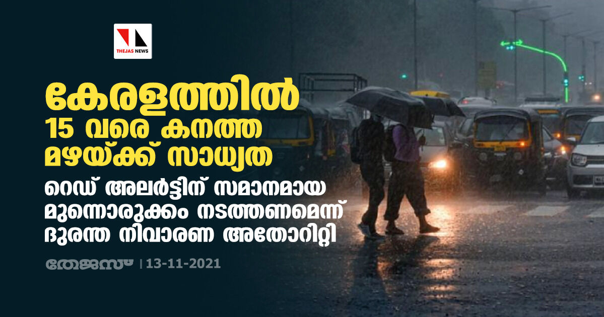 കേരളത്തില് 15 വരെ കനത്ത മഴയ്ക്ക് സാധ്യത;റെഡ് അലര്ട്ടിന് സമാനമായ മുന്നൊരുക്കം നടത്തണമെന്ന് ദുരന്ത നിവാരണ അതോറിറ്റി