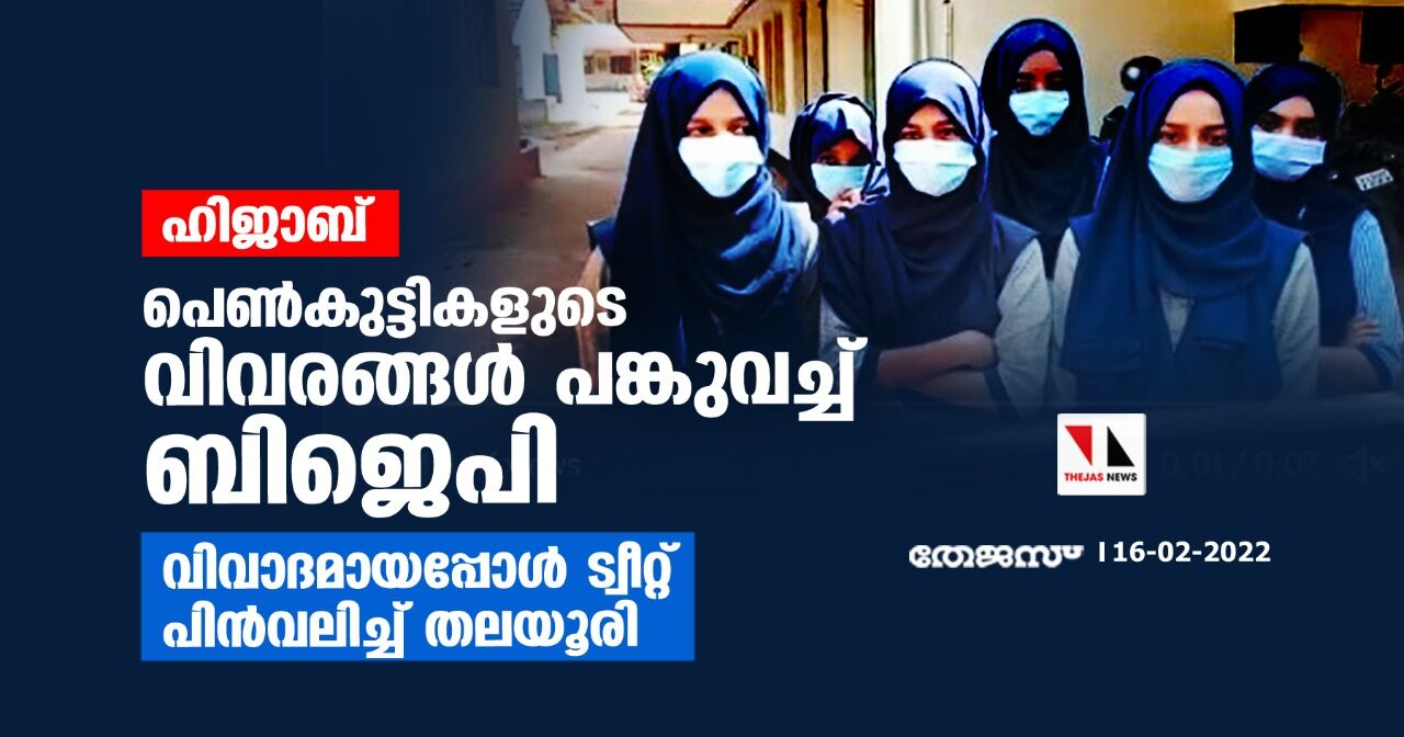 ഹിജാബ്: പെണ്കുട്ടികളുടെ വിവരങ്ങള് പങ്കുവച്ച് ബിജെപി; വിവാദമായപ്പോള് ട്വീറ്റ് പിന്വലിച്ച് തലയൂരി