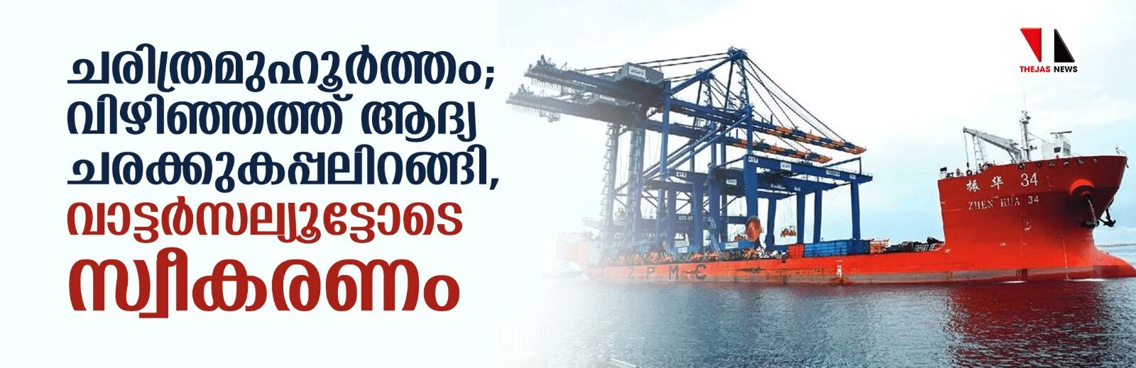 ചരിത്രമുഹൂര്ത്തം; വിഴിഞ്ഞത്ത് ആദ്യ ചരക്കുകപ്പലിറങ്ങി, വാട്ടര്സല്യൂട്ടോടെ സ്വീകരണം