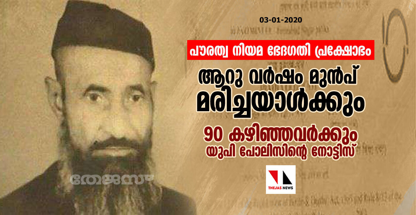 പൗരത്വ നിയമ ഭേദഗതി പ്രക്ഷോഭം: ആറു വര്ഷം മുന്പ് മരിച്ചയാള്ക്കും 90 കഴിഞ്ഞവര്ക്കും യുപി പോലിസിന്റെ നോട്ടിസ്