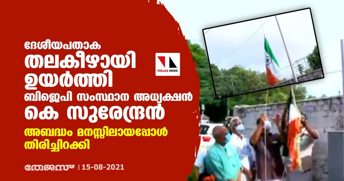 (വീഡിയോ) ദേശീയപതാക തലകീഴായി ഉയര്ത്തി ബിജെപി സംസ്ഥാന അധ്യക്ഷന് കെ സുരേന്ദ്രന്; അബദ്ധം മനസ്സിലായപ്പോള് തിരിച്ചിറക്കി