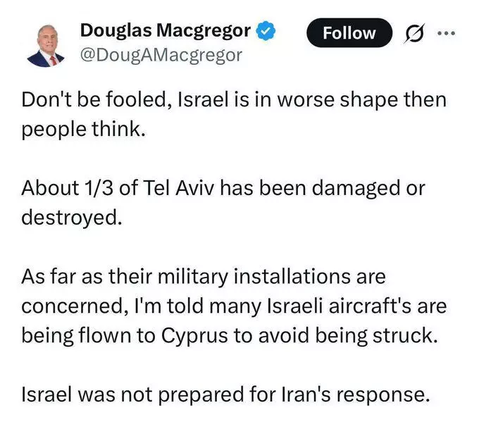 '''വഞ്ചിതരാകരുത്, ഇസ്രായേല് ഇപ്പോള് ആളുകള് കരുതുന്നതിലും മോശമായ അവസ്ഥയിലാണ്. തെല് അവീവിന്റെ ഏകദേശം 1/3 ഭാഗത്തിന് കേടുപാടുകള് സംഭവിച്ചിട്ടുണ്ട് അല്ലെങ്കില് നശിപ്പിക്കപ്പെട്ടിട്ടുണ്ട്. ആക്രമിക്കപ്പെടാതിരിക്കാന് നിരവധി ഇസ്രായേലി വിമാനങ്ങള് സൈപ്രസിലേക്ക് പറത്തുന്നുണ്ടെന്ന് എനിക്ക് വിവരം ലഭിച്ചു. ഇറാന്റെ സൈനിക നടപടി നേരിടാന് ഇസ്രായേല് തയ്യാറെടുത്തിരുന്നില്ല.''-അദ്ദേഹം എക്സില് പോസ്റ്റ് ചെയ്തു. ഇറാനുമായി യുഎസ് യുദ്ധം ചെയ്യരുതെന്നാണ് കേണല് ഡഗ്ലാസ് മാക്ഗ്രിഗറുടെ അഭിപ്രായം.