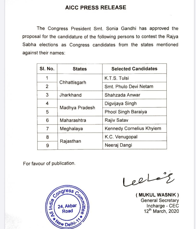 ഇന്ന് വൈകിട്ടാണ് കോണ്ഗ്രസ് രാജ്യസഭാ സ്ഥാനാര്ത്ഥി പട്ടിക പുറത്തുവിട്ടത്. മുതിര്ന്ന നേതാവ് ദിഗ്വിജയ സിംഗ് മധ്യപ്രദേശില് നിന്ന് മത്സരിക്കും.