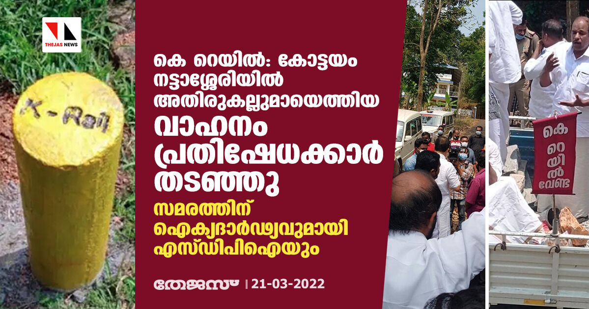 കെ റെയില്: കോട്ടയം നട്ടാശ്ശേരിയില് അതിരുകല്ലുമായെത്തിയ വാഹനം പ്രതിഷേധക്കാര് തടഞ്ഞു; സമരത്തിന് ഐക്യദാര്ഢ്യവുമായി എസ്ഡിപിഐയും