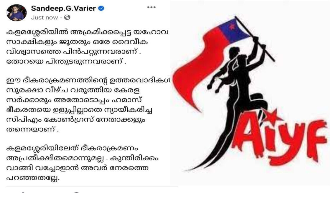 കളമശ്ശേരി സ്ഫോടന പരമ്പര: വിദ്വേഷ പ്രചാരണത്തിന് സന്ദീപ് വാര്യര്ക്കെതിരെ കേസെടുക്കണമെന്ന് എഐവൈഎഫ്