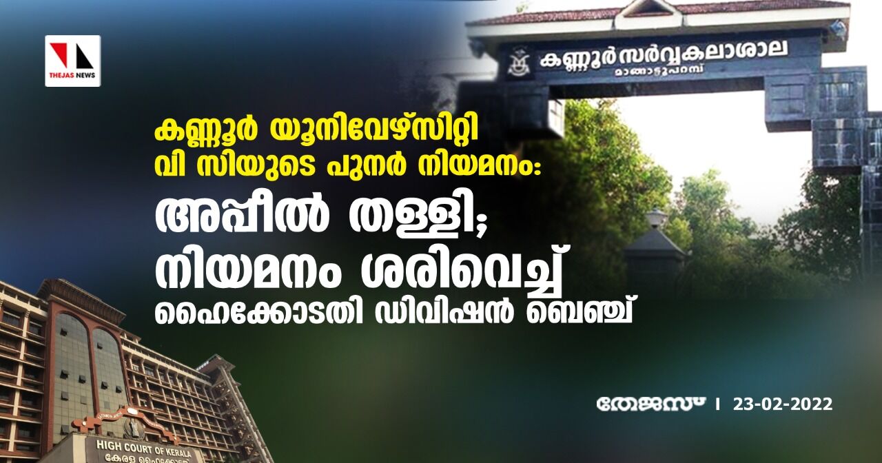 കണ്ണൂര് യൂനിവേഴ്സിറ്റി വി സിയുടെ പുനര് നിയമനം:അപ്പീല് തള്ളി ; നിയമനം ശരിവെച്ച് ഹൈക്കോടതി ഡിവിഷന് ബെഞ്ച്
