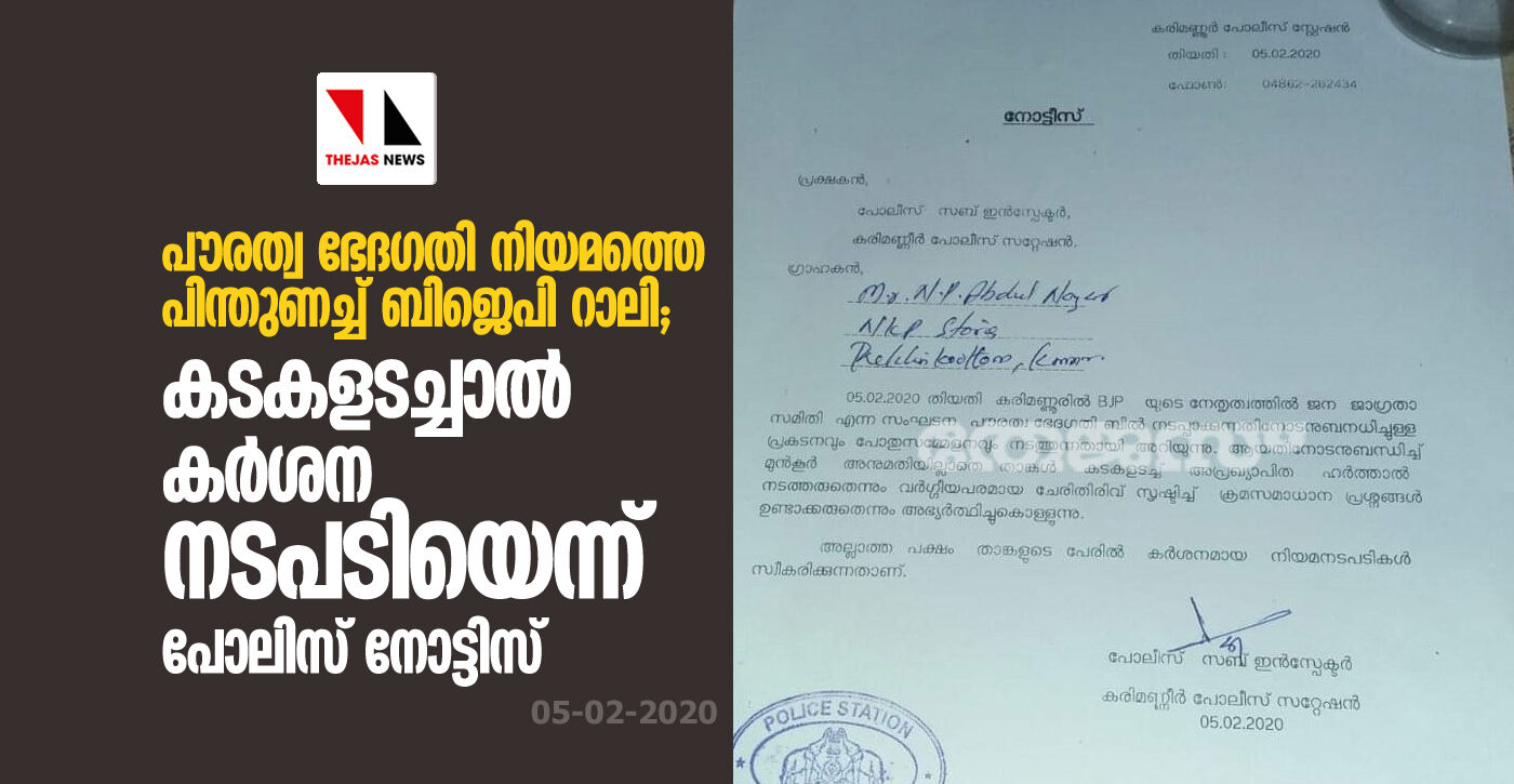 പൗരത്വ നിയമത്തെ പിന്തുണച്ച് ബിജെപി റാലി; കടകളടച്ചാല് കര്ശന നടപടിയെന്ന് പോലിസ് നോട്ടിസ്