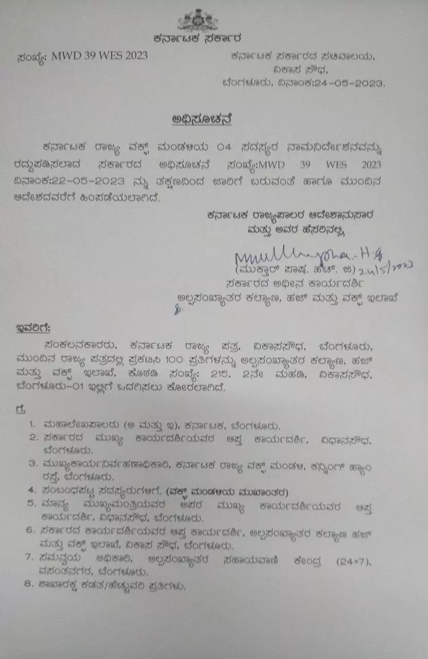 കര്ണാടക സംസ്ഥാന വഖ്ഫ് ബോര്ഡിലെ നാല് അംഗങ്ങളെ നാമനിര്ദേശം റദ്ദാക്കിയ തീരുമാനം അടിയന്തിരമായി മറ്റൊരു അറിയിപ്പ് ഉണ്ടാവുന്നതുവരെ പിന്വലിച്ചിരിക്കുന്നു എന്നാണ് ഉത്തരവിലുള്ളത്. സംസ്ഥാന വഖ്ഫ് ബോര്ഡിലെ 10 അംഗങ്ങളില് ആറുപേര് വിവിധ കാറ്റഗറികളിലായി തിരഞ്ഞെടുക്കപ്പെട്ടവരാണ്. മറ്റു നാലുപേര് സര്ക്കാര് നോമിനികളും. സര്ക്കാര് നോമിനികളുടെ നാമനിര്ദേശമാണ് കേന്ദ്ര വഖ്ഫ് നിയമത്തിലെ 20ാം വകുപ്പ് പ്രകാരം സിദ്ധരാമയ്യ സര്ക്കാര് റദ്ദാക്കിയെന്നു കാണിച്ച് കഴിഞ്ഞ ദിവസം ഉത്തരവ് പുറപ്പെടുവിച്ചത്. 2021 നവംബര് 17ന് വഖ്ഫ് ബോര്ഡ് ചെയര്മാന് സ്ഥാനത്തേക്ക് നടന്ന തെരഞ്ഞെടുപ്പില് കര്ണാടക മുസ്ലിം ജമാഅത്ത് ജനറല് സെക്രട്ടറിയായിരുന്ന ഷാഫി സഅദി കോണ്ഗ്രസ് പിന്തുണയുണ്ടായിരുന്ന ആസിഫ് അലി ഷെയ്ക്ക് ഹുസനെയാണ് പരാജയപ്പെടുത്തിയിരുന്നത്. എന്നാല്, ഷാഫി സഅദിയുടെ ജയം തങ്ങളുടെ ജയമാണെന്ന് അവകാശപ്പെട്ട് ബിജെപി ആഘോഷിച്ചിരുന്നു. കഴിഞ്ഞദിവസം ഷാഫി സഅദി ഉപമുഖ്യമന്ത്രി ഡി കെ ശിവകുമാറിനെ സന്ദര്ശിച്ചിരുന്നു. പിന്നാലെയാണ് വഖ്ഫ് ബോര്ഡിലെ നാമനിര്ദേശങ്ങള് റദ്ദാക്കിയിരുന്നത്. ബിജെപി പിന്തുണയുള്ളതിനാലാണ് റദ്ദാക്കിയതെന്നായിരുന്നു പ്രചാരണം. എന്നാല്, കഴിഞ്ഞ ബിജെപി സര്ക്കാറിന്റെ കാലത്ത് കര്ണാടക സംസ്ഥാന സര്ക്കാറിന്റെ വിവിധ കോര്പറേഷനുകള്, ബോര്ഡുകള്, സ്വയംഭരണ സ്ഥാപനങ്ങള്, മറ്റ് സര്ക്കാര്, സര്ക്കാറിതര, മറ്റ് എല്ലാ പ്രസിഡന്റുമാര്, ഡയറക്ടര്മാര്, അംഗങ്ങള് എന്നിവരുടെ ശിപാര്ശകളും നിയമനങ്ങളും സിദ്ധരാമയ്യ സര്ക്കാര് റദ്ദാക്കിയിരുന്നു. കാന്തപുരം വിഭാഗം സുന്നി നേതാവായ ഷാഫി സഅദിയുടെ നിയമനം റദ്ദാക്കിയത് കേരളത്തില് ഉള്പ്പെടെ വലിയ ചര്ച്ചയായിരുന്നു. ഇതിനു പിന്നാലെയാണ് നിയമനം റദ്ദാക്കിയ ഉത്തരവ് പിന്വലിച്ച് സിദ്ധരാമയ്യ സര്ക്കാര് രംഗത്തെത്തിയത്.