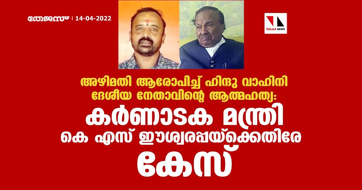 അഴിമതി ആരോപിച്ച് ഹിന്ദു വാഹിനി ദേശീയ നേതാവിന്റെ ആത്മഹത്യ: കര്ണാടക മന്ത്രി കെ എസ് ഈശ്വരപ്പയ്ക്കെതിരേ കേസ്