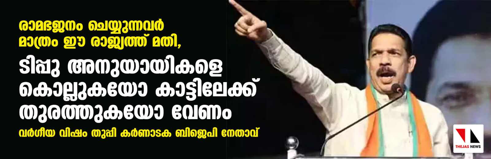 രാമഭജനം ചെയ്യുന്നവര് മാത്രം ഈ രാജ്യത്ത് മതി, ടിപ്പു അനുയായികളെ കൊല്ലുകയോ കാട്ടിലേക്ക് തുരത്തുകയോ വേണം; വര്ഗീയ വിഷം തുപ്പി കര്ണാടക ബിജെപി നേതാവ്
