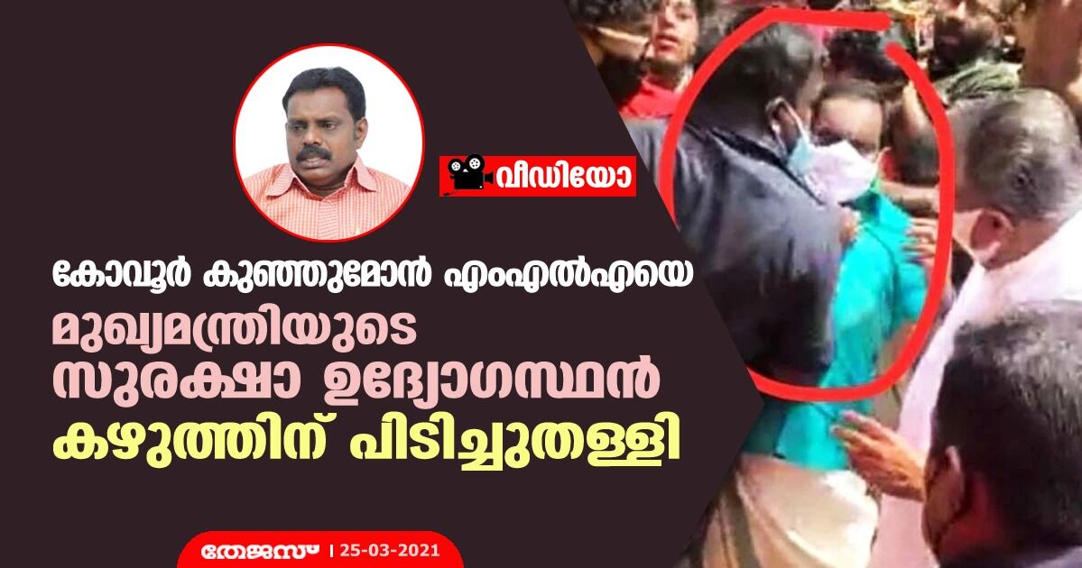 മുഖ്യമന്ത്രിയ്ക്കൊപ്പം വേദിയിലേക്ക് കയറുന്നതിനിടെയായിരുന്നു സംഭവം. കുഞ്ഞുമോന്റെ തിരഞ്ഞെടുപ്പ് പ്രചാരണം ഉദ്ഘാടനം ചെയ്യാനെത്തിയതായിരുന്നു മുഖ്യമന്ത്രി. തിരക്ക് നിയന്ത്രിക്കുന്നതിനിടെ സുരക്ഷാ ഉദ്യോഗസ്ഥന് എംഎല്എയെ തിരിച്ചറിയാതെ പോയതാണെന്നാണ് കോവൂര് കുഞ്ഞുമോനുമായി ബന്ധപ്പെട്ടവരുടെ വിശദീകരണം.