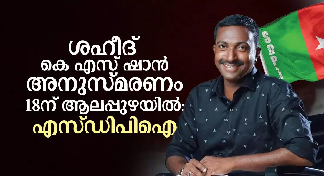 തിരുവനന്തപുരം: എസ്ഡിപിഐ സംസ്ഥാന സെക്രട്ടറിയായിരുന്ന കെ എസ് ഷാനിന്റെ രക്തസാക്ഷി ദിനമായ ഡിസംബര് 18ന് ആലപ്പുഴയില് അനുസ്മരണ സമ്മേളനം നടക്കും. വൈകീട്ട് നാലിന് ആലപ്പുഴ ഇഎംഎസ് സ്റ്റേഡിയത്തില് നടക്കുന്ന അനുസ്മരണ സമ്മേളനം എസ്ഡിപിഐ സംസ്ഥാന പ്രസിഡന്റ് സി പി എ ലത്തീഫ് ഉദ്ഘാടനം ചെയ്യുമെന്ന് സംസ്ഥാന ജനറല് സെക്രട്ടറി പി ആര് സിയാദ് അറിയിച്ചു.