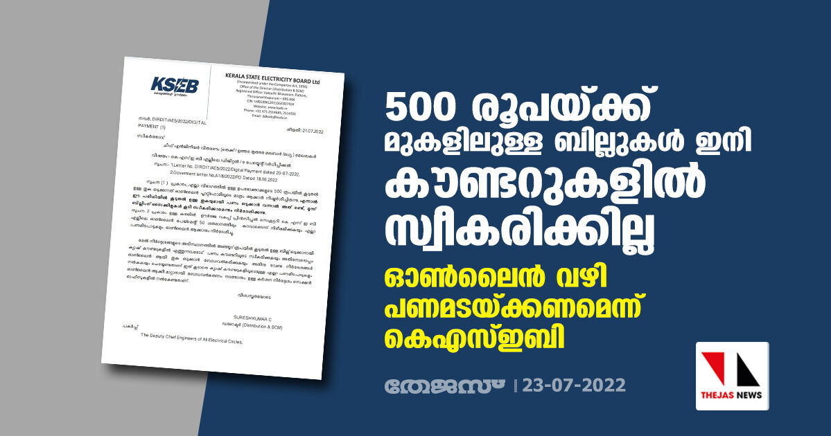 500 രൂപയ്ക്ക് മുകളിലുള്ള ബില്ലുകള് ഇനി കൗണ്ടറുകളില് സ്വീകരിക്കില്ല; ഓണ്ലൈന് വഴി പണമടയ്ക്കണമെന്ന് കെഎസ്ഇബി