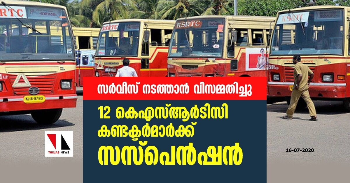 സര്വീസ് നടത്താന് വിസമ്മതിച്ചു; 12 കെഎസ്ആര്ടിസി കണ്ടക്ടര്മാര്ക്ക് സസ്പെന്ഷന്
