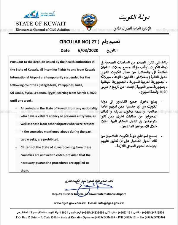 ഇന്ത്യ ഉള്പ്പെടെ ഏഴ് രാജ്യങ്ങളില് നിന്നുള്ള വിമാനങ്ങള്ക്കു കുവൈത്തില് വിലക്ക്