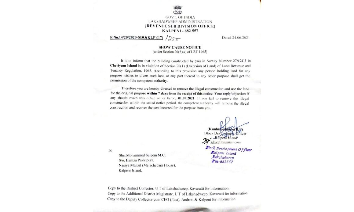 ചെറിയം ദ്വീപിലെ മല്സ്യത്തൊഴിലാളി ഷെഡുകള് പൊളിക്കാന് ആവശ്യപ്പെട്ട് നല്കിയ കാരണം കാണിക്കല് നോട്ടീസ്