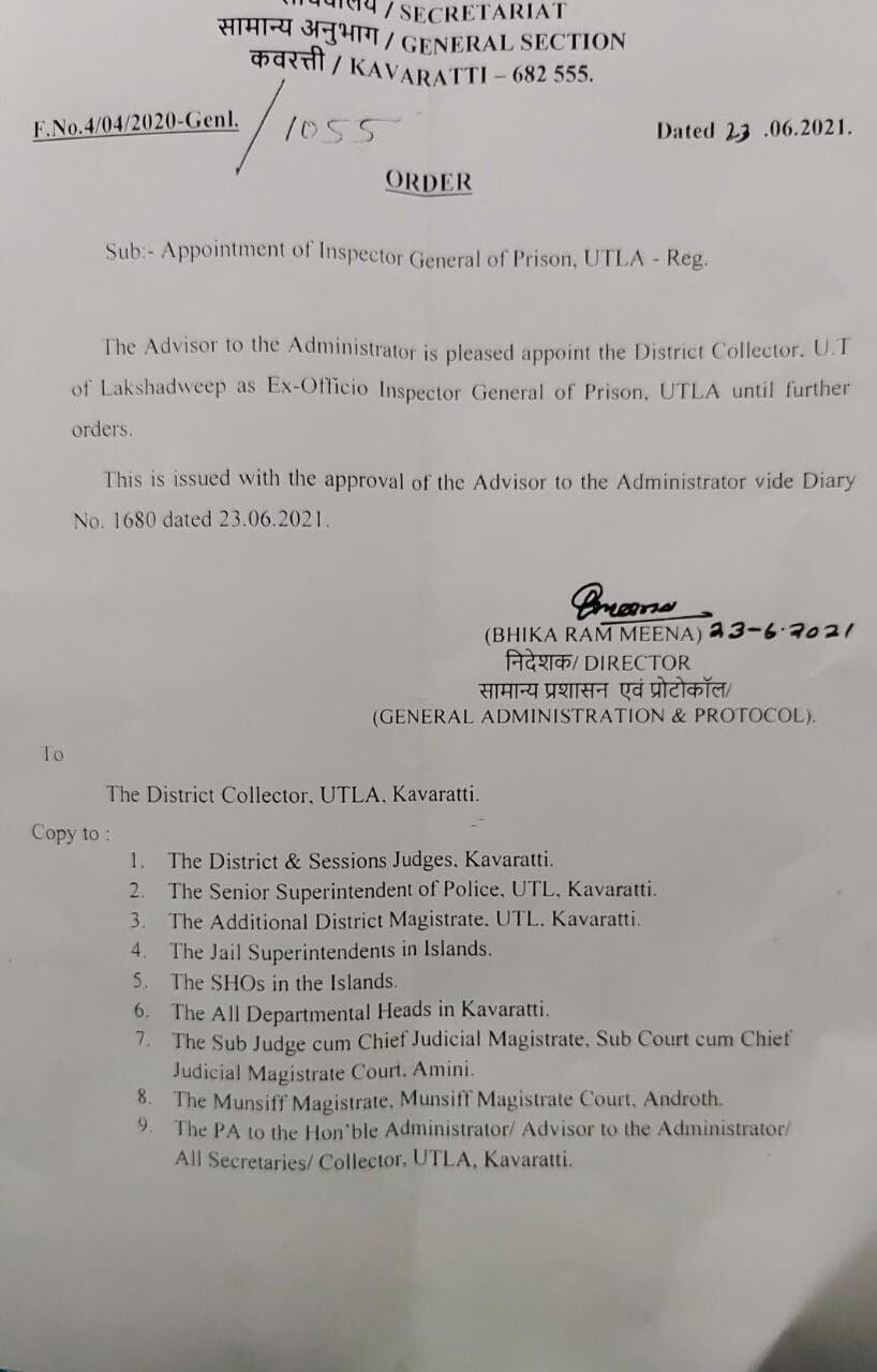 ലക്ഷദ്വീപില് ഇന്സ്പെക്ടര് ജനറല് ഓഫ് പ്രിസണ്സി(ജയില് ഐജി)നെ നിയമിച്ച് ഭരണകൂടം പുറത്തിറക്കിയ ഉത്തരവ്
