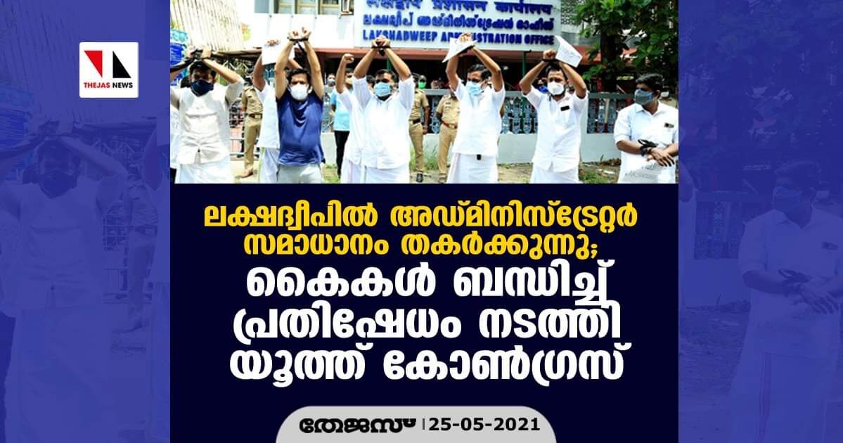 ലക്ഷദ്വീപില് അഡ്മിനിസ്ട്രേറ്റര് സമാധാനം തകര്ക്കുന്നു; കൈകള് ബന്ധിച്ച് പ്രതിഷേധം നടത്തി യൂത്ത് കോണ്ഗ്രസ്