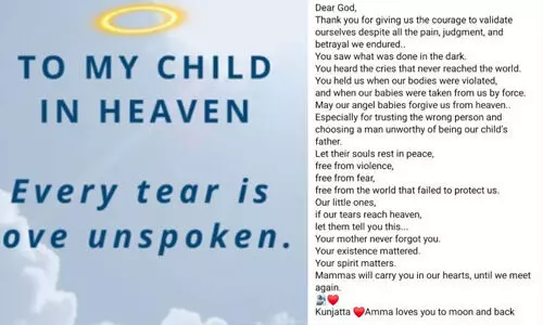 പ്രിയപ്പെട്ട ദൈവമേ, എല്ലാ വേദനകളും, വിധികളും, വഞ്ചനകളും സഹിച്ച് മുന്നോട്ട് പോകാന് ധൈര്യം നല്കിയതിന് നന്ദി. ഇരുട്ടില് അയാള് ചെയ്ത പ്രവൃത്തി നീ കണ്ടു. ലോകത്തിന് മുന്നില് എത്താതിരുന്ന നിലവിളികള് നീ കേട്ടു. ഞങ്ങളുടെ ശരീരം ആക്രമിക്കപ്പെട്ടപ്പോഴും ഞങ്ങളുടെ കുഞ്ഞുങ്ങളെ ബലപ്രയോഗത്തിലൂടെ തട്ടിയെടുത്തപ്പോളും നീ ഞങ്ങളെ ചേര്ത്തു പിടിച്ചു. ആ മാലാഖ കുഞ്ഞുങ്ങള് സ്വര്ഗത്തില് നിന്ന് ഞങ്ങളോട് ക്ഷമിക്കട്ടെ. തെറ്റായ വ്യക്തിയെ വിശ്വസിച്ച് കുട്ടിയുടെ പിതാവാകാന് യോഗ്യനല്ലാത്ത ഒരാളെ തിരിഞ്ഞെടുത്തതിന് ക്ഷമ ചോദിക്കുന്നു.