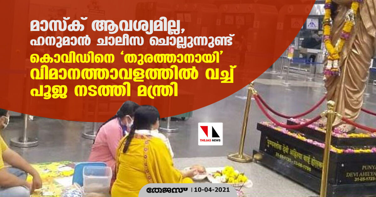 മാസ്ക് ആവശ്യമില്ല, ഹനുമാൻ ചാലീസ ചൊല്ലുന്നുണ്ട്; കൊവിഡിനെ 'തുരത്താനായി' വിമാനത്താവളത്തിൽ വച്ച് പൂജ നടത്തി മന്ത്രി