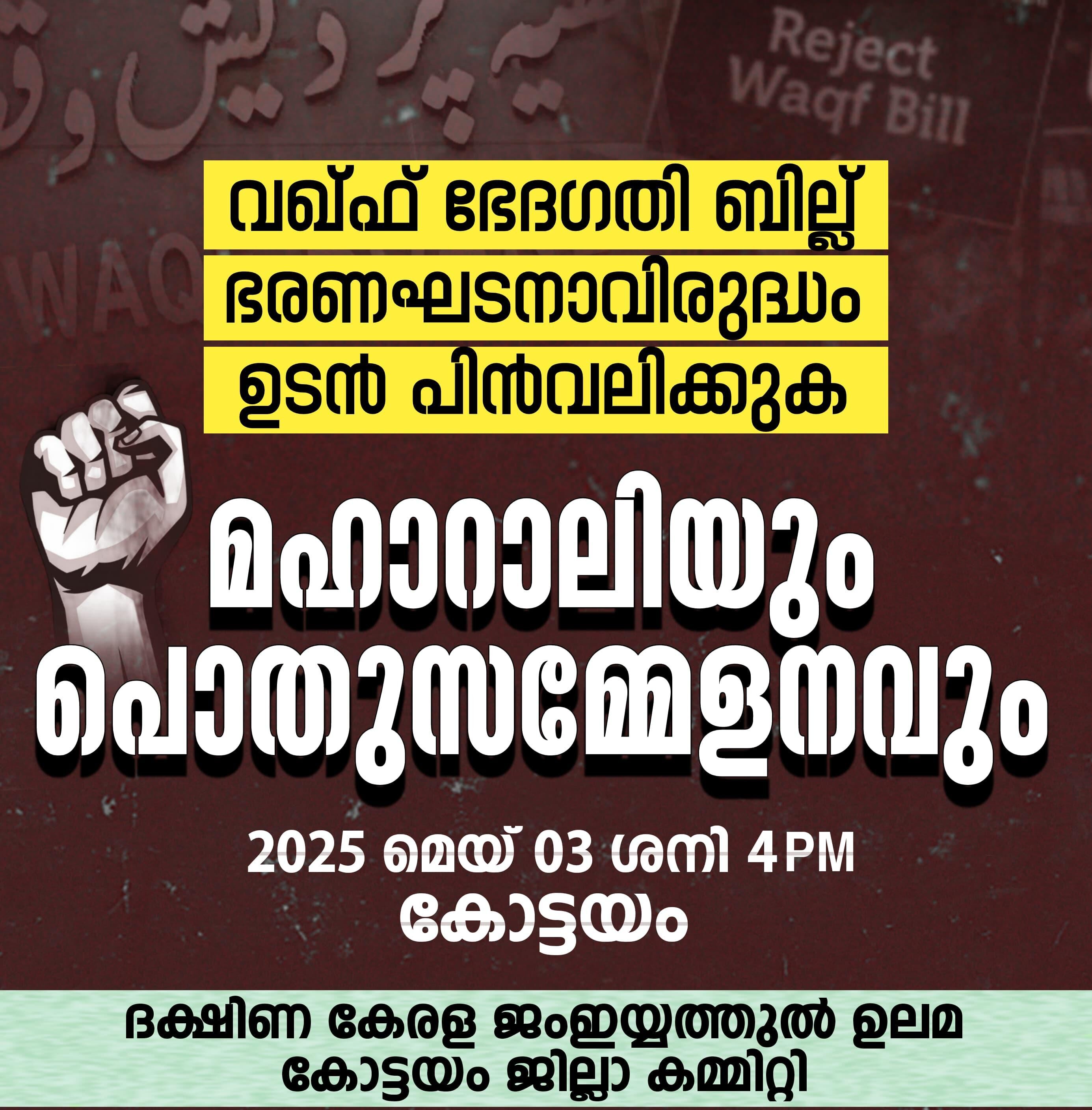 വഖ്ഫ് ഭേദഗതി നിയമത്തിനെതിരെ കോട്ടയത്ത് മേയ് മൂന്നിന് മഹാറാലി