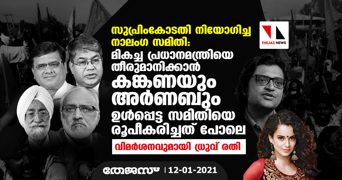 സുപ്രീംകോടതി നിയോഗിച്ച നാലംഗ സമിതി: മികച്ച പ്രധാനമന്ത്രിയെ തീരുമാനിക്കാന് കങ്കണയും അര്ണബും ഉള്പ്പെട്ട സമിതിയെ രൂപീകരിച്ചത് പോലെ- ധ്രുവ് രതി