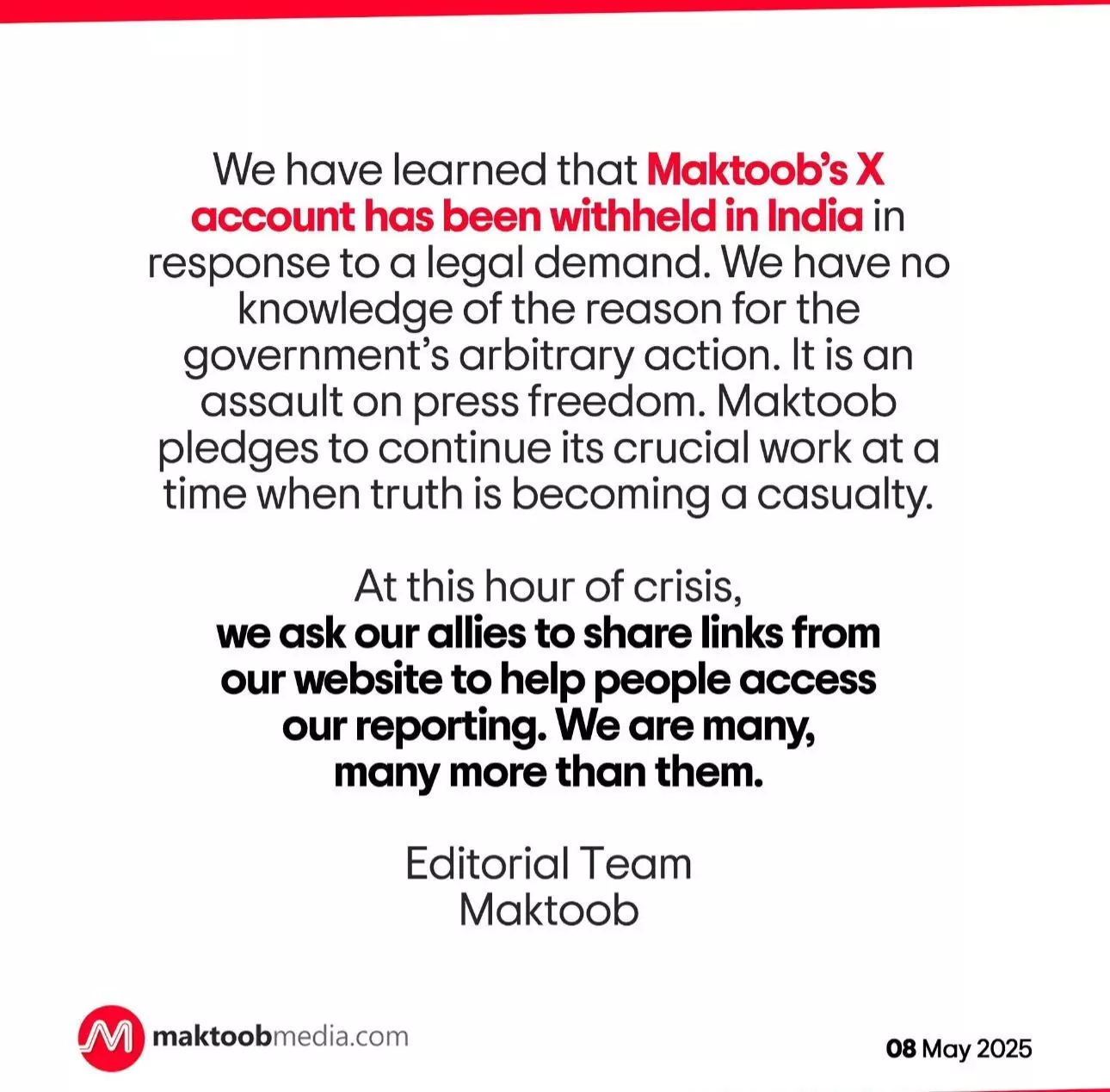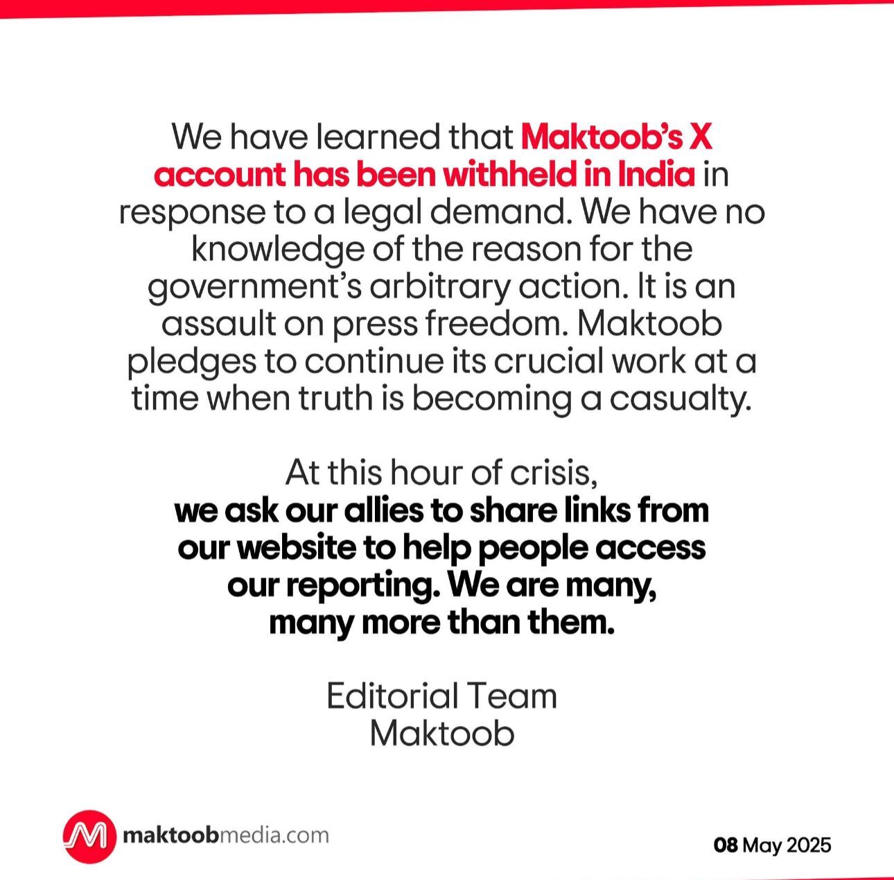 മക്തൂബിന്റെ എക്സ് അക്കൗണ്ട് ഇന്ത്യയില് തടഞ്ഞു
